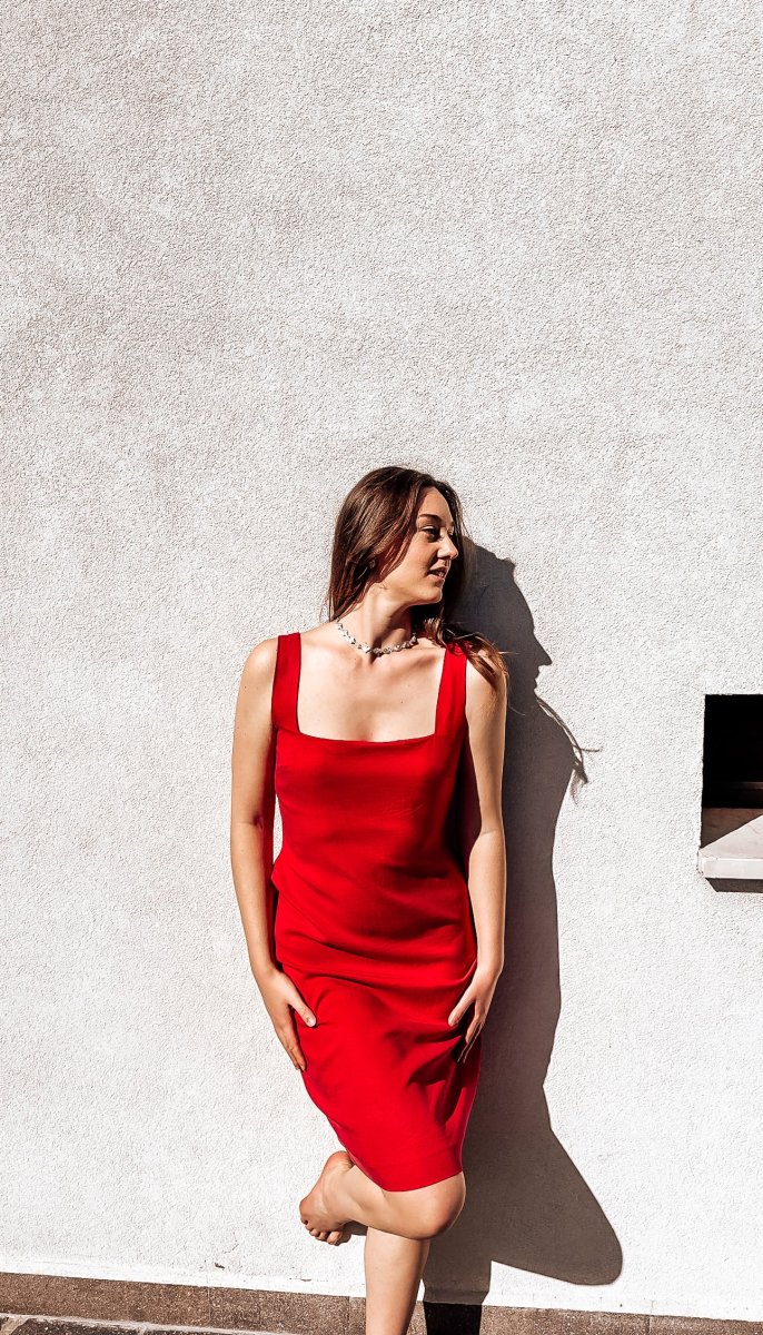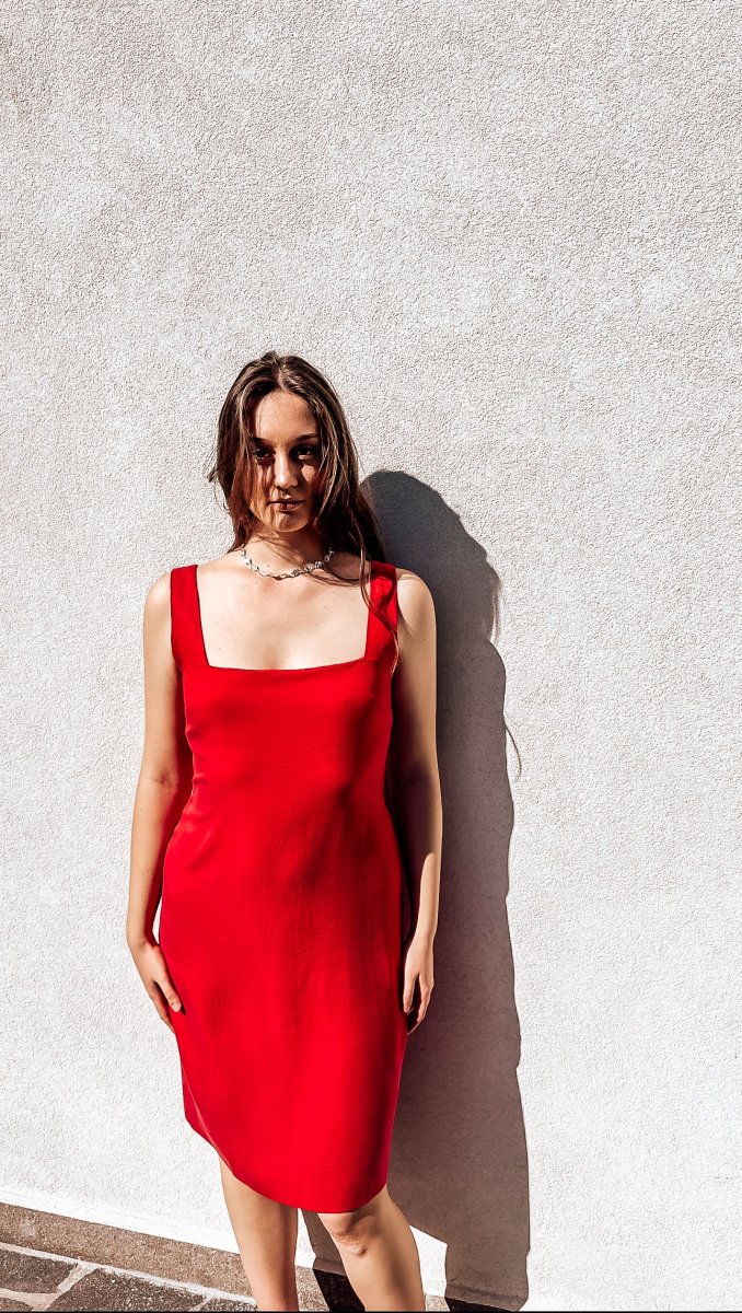 Abito da giorno a tubino rosso con spacco posteriore e scollo quadrato senza maniche, confezionato su misura.