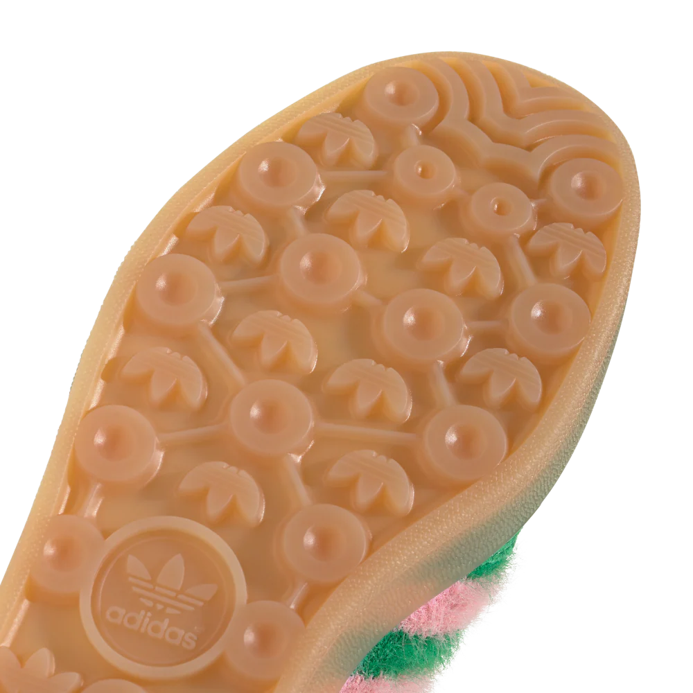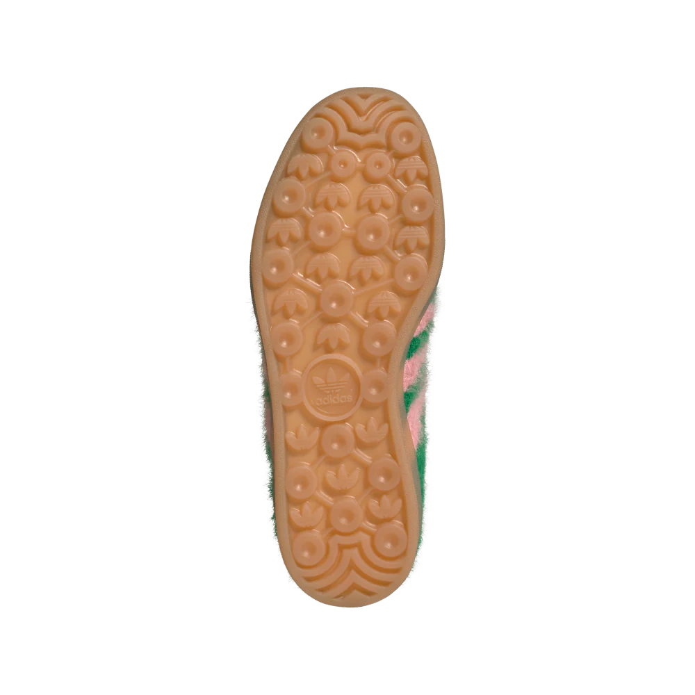 La caratteristica principale è la suola in gomma semitrasparente che avvolge l’intera scarpa, introducendo un elemento di novità nell’iconica intersuola bianca testurizzata della Gazelle originale del 1968.