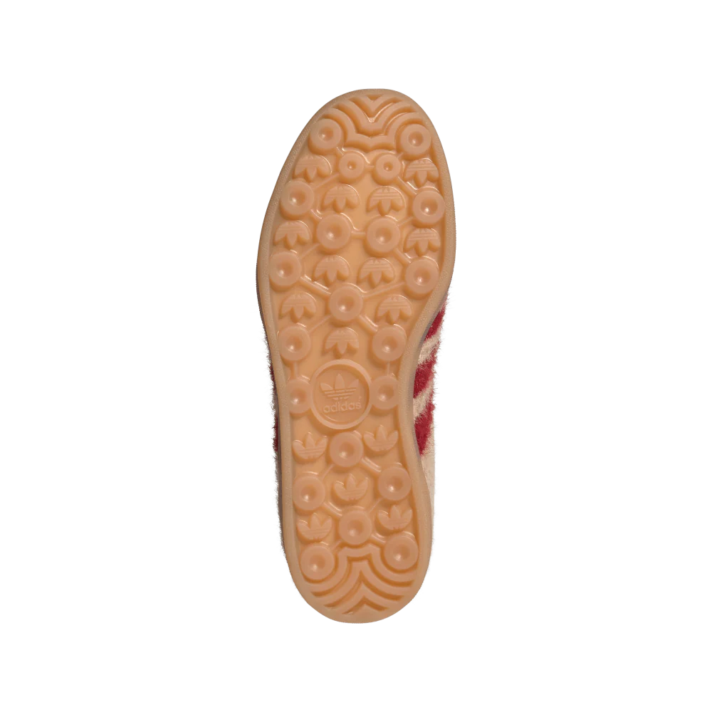 La caratteristica principale è la suola in gomma semitrasparente che avvolge l’intera scarpa, introducendo un elemento di novità nell’iconica intersuola bianca testurizzata della Gazelle originale del 1968.