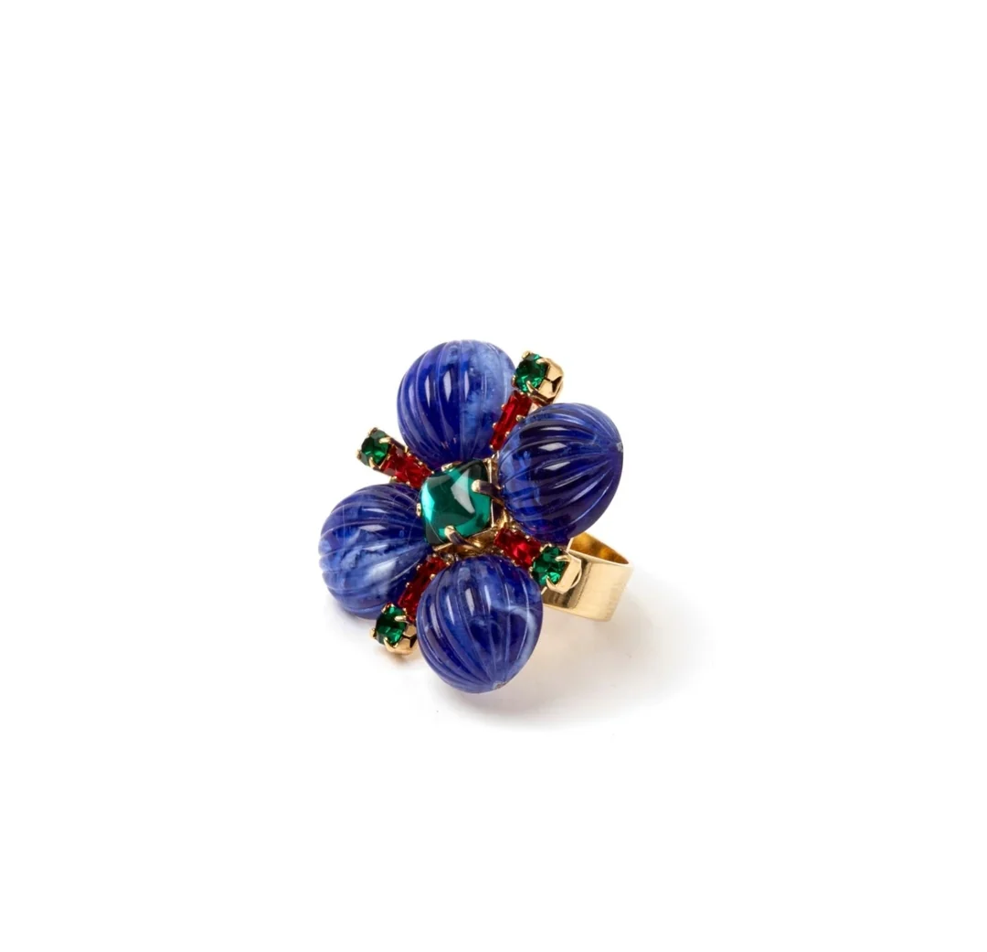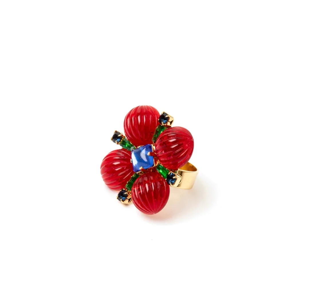 Un anello elegante e regolabile, ideale per esprimere il tuo stile chic e attento ai dettagli. Il design luminoso e cromatico si arricchisce di una splendente top a fiore, con elementi dalle nuances lussureggianti. Perfetto per ogni outfit, disponibile nelle tonalità del blu, rosso, verde e oro. Logo Sodini sulla fascia 🌸