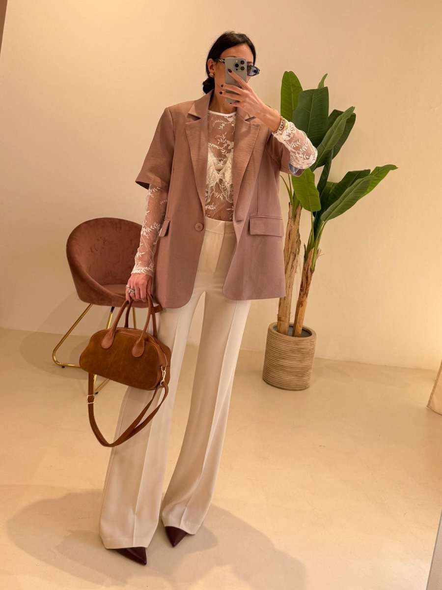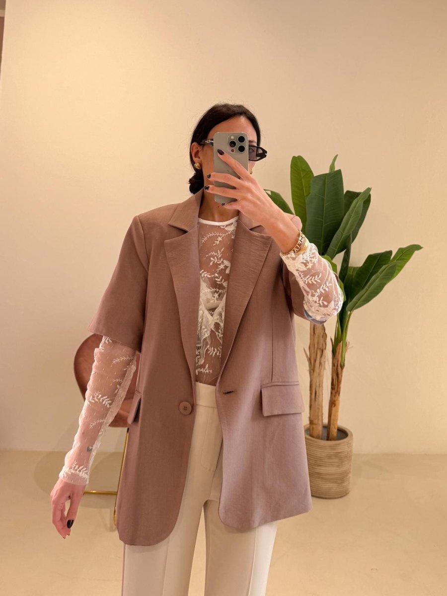 Giacca manica corta chiusura centrale con bottone in tessuto Modello lungo Con spallina e fodera all’ interno gessata COMPOSIZIONE: VISCOSA/POLYAMMIDE/POLYESTERE