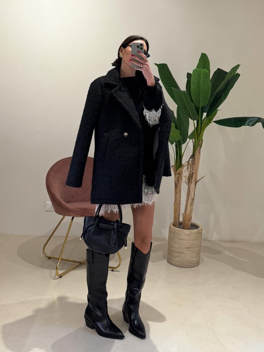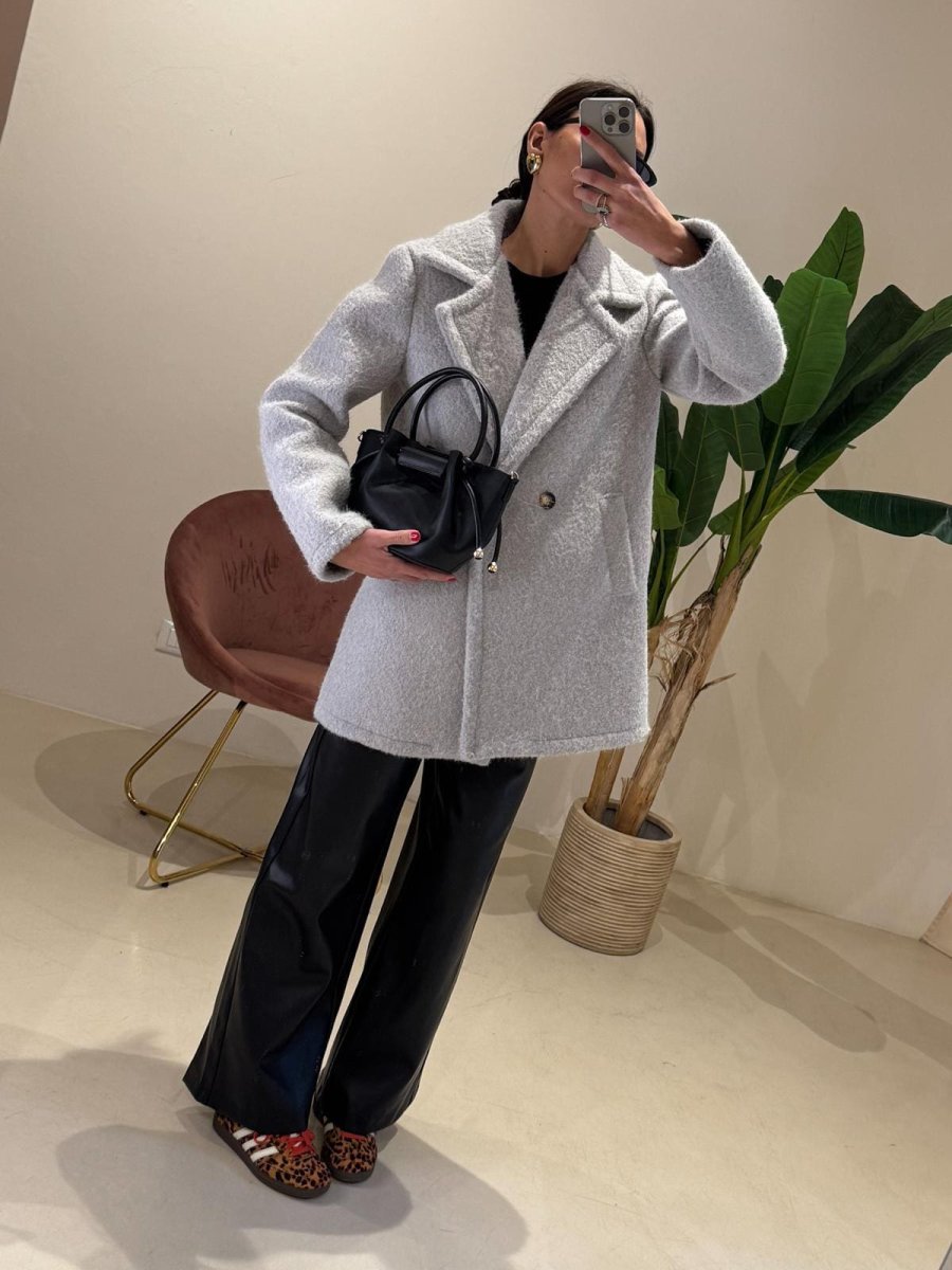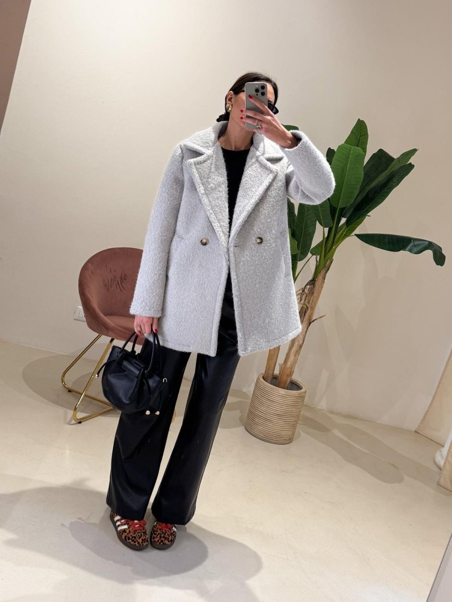 Cappottino Neoprene grigio nero Effetto pelosino Chiusura doppio petto centrale Vestibilità fino alla M/L Sofia H 173cm Composizione: 90% viscosa 10% elasthan