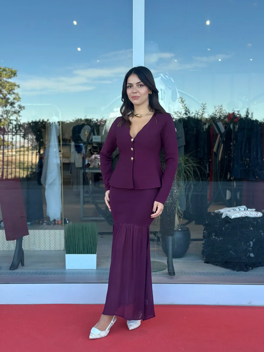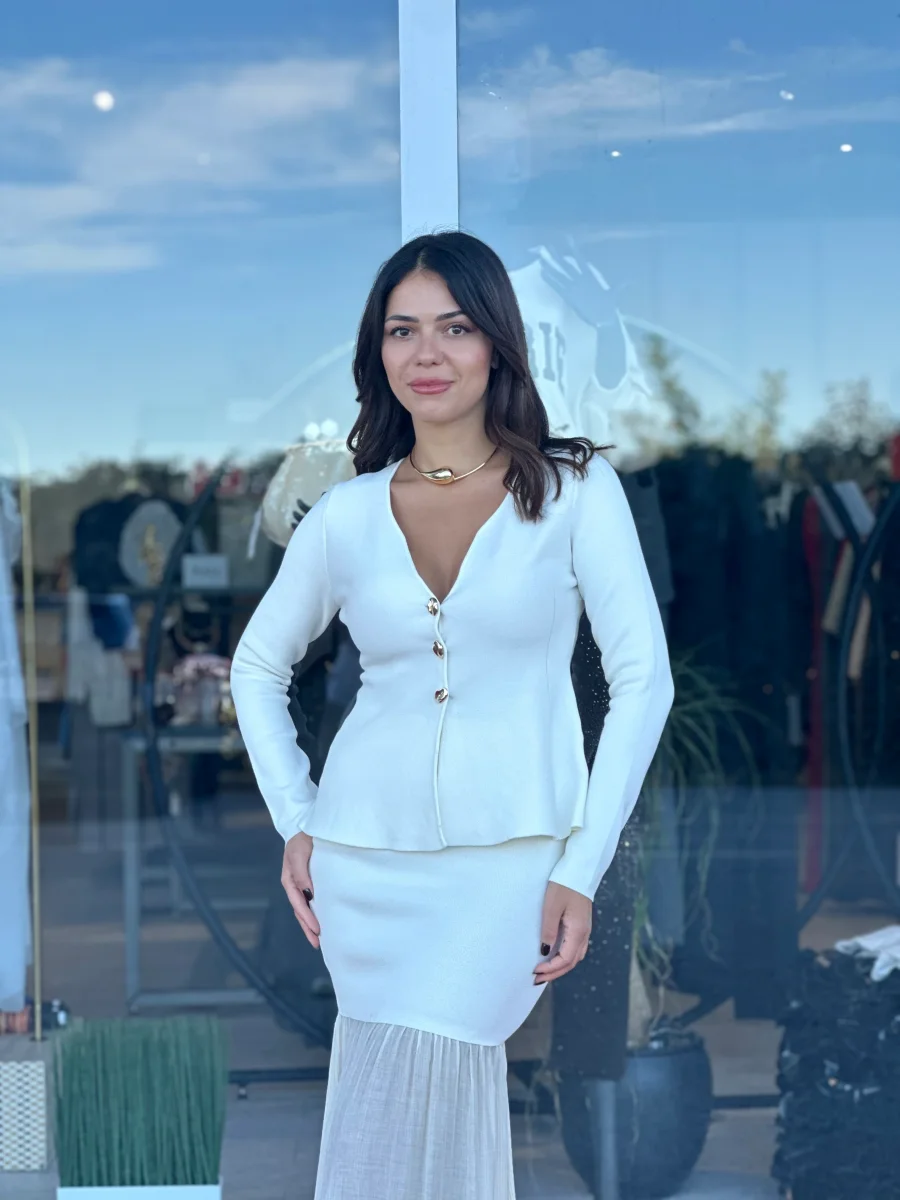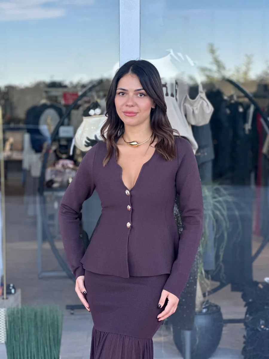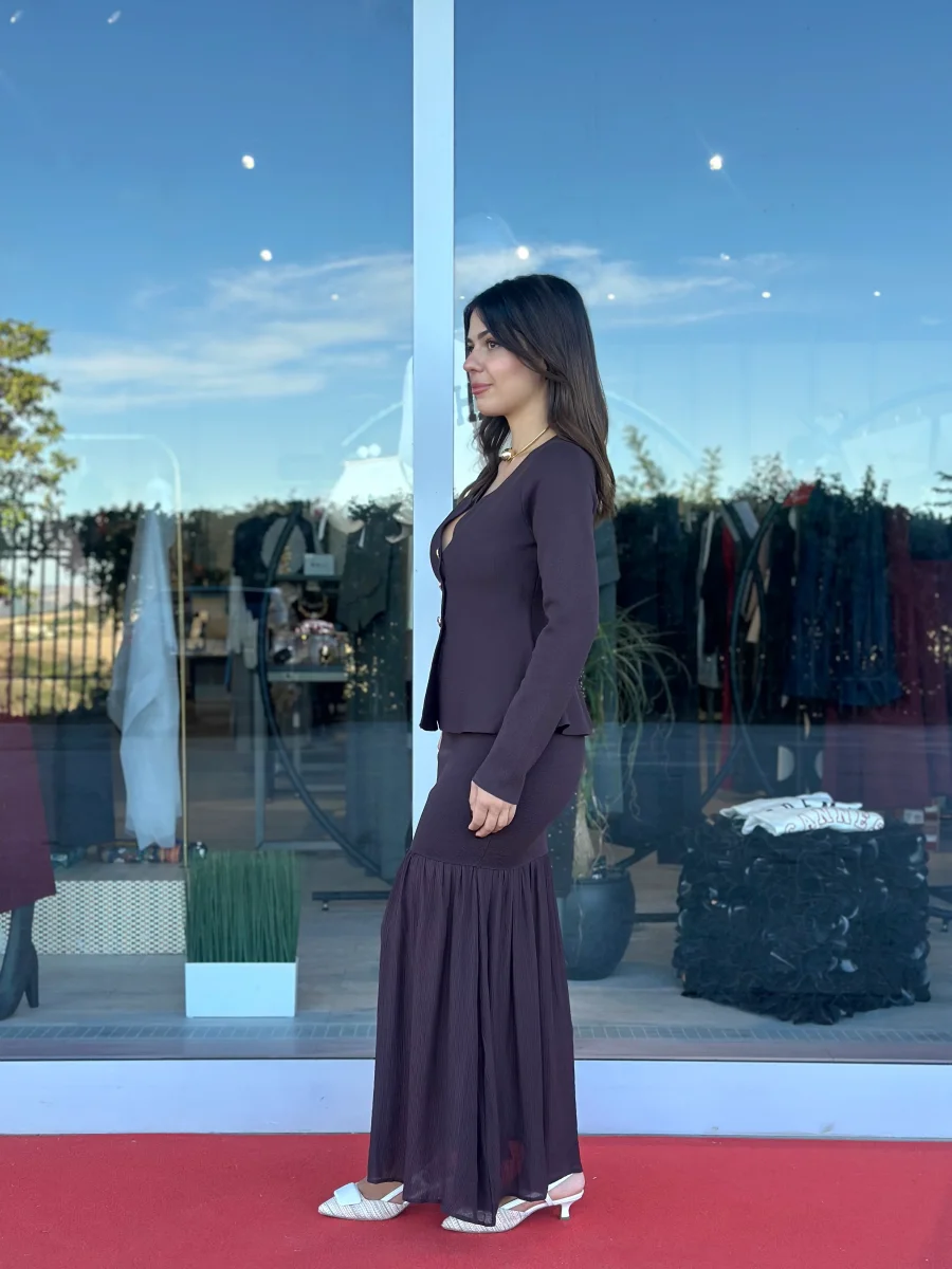 Coordinato in maglia composto da gonna a sirena con fondo in tessuto a contrasto e top modello cardigan con scollo a cuore e bottoni gioiello.