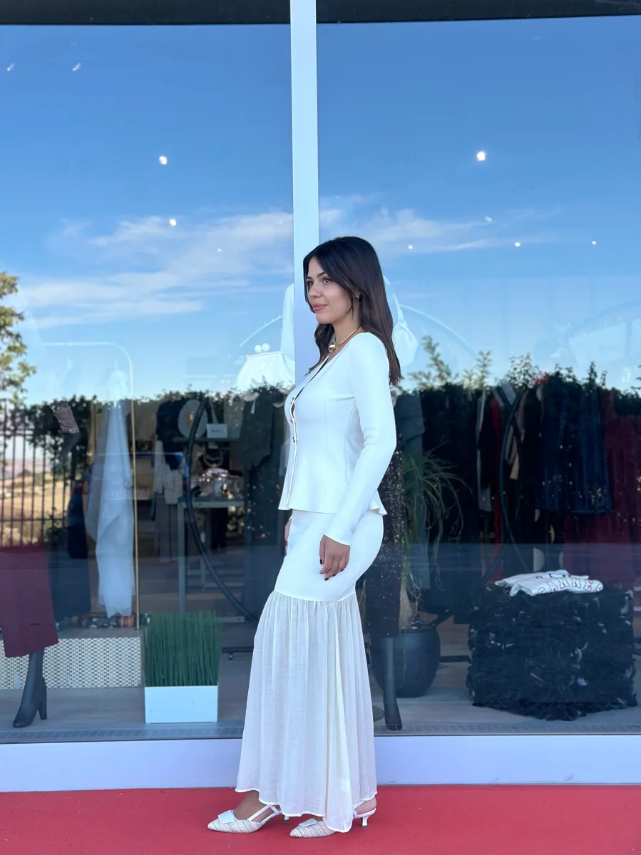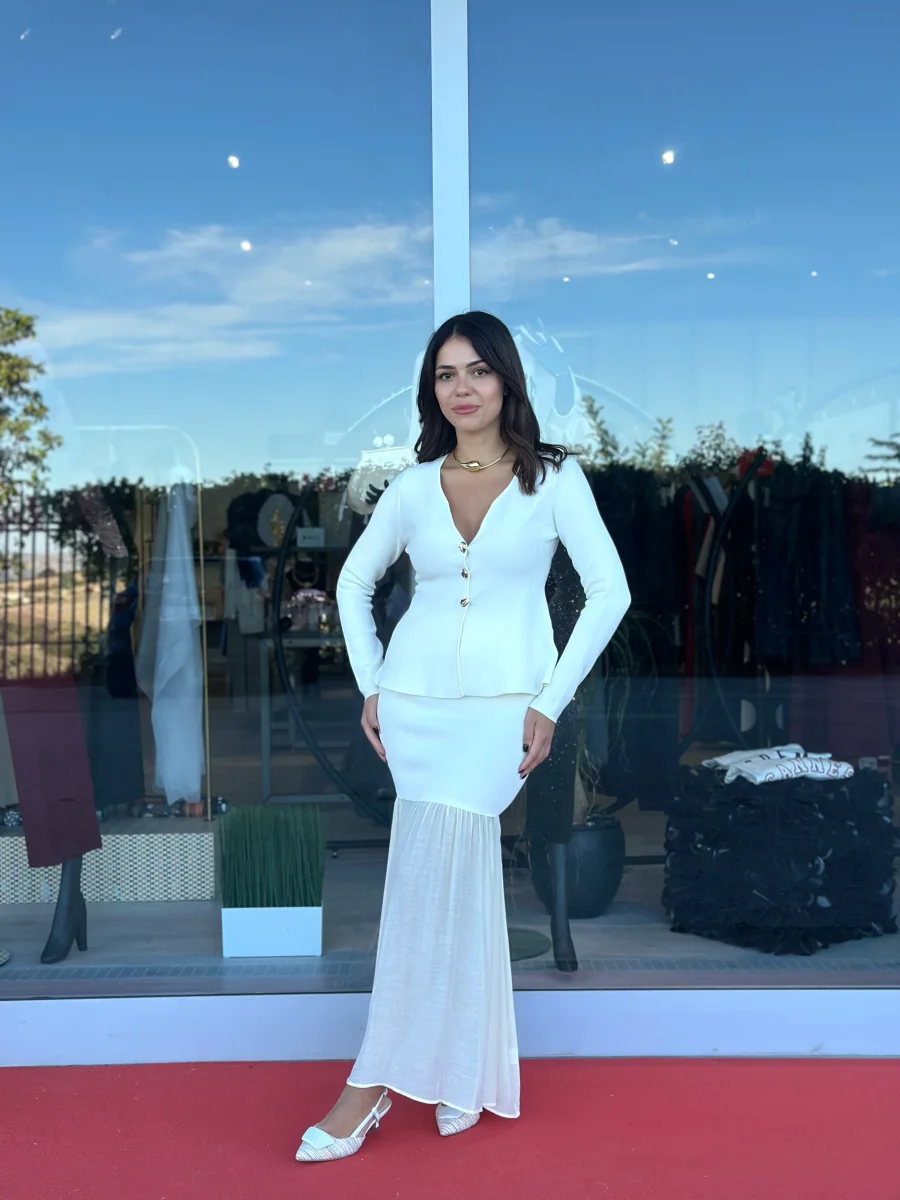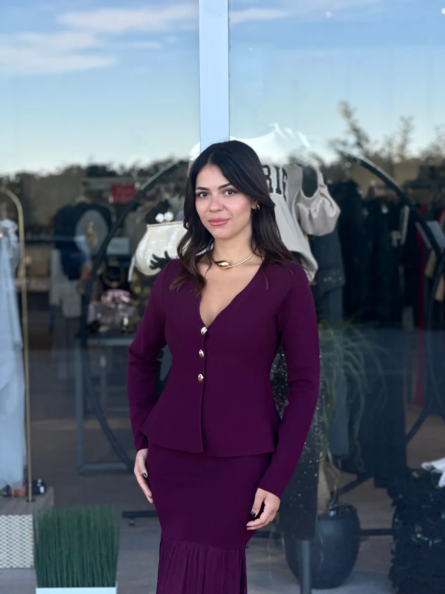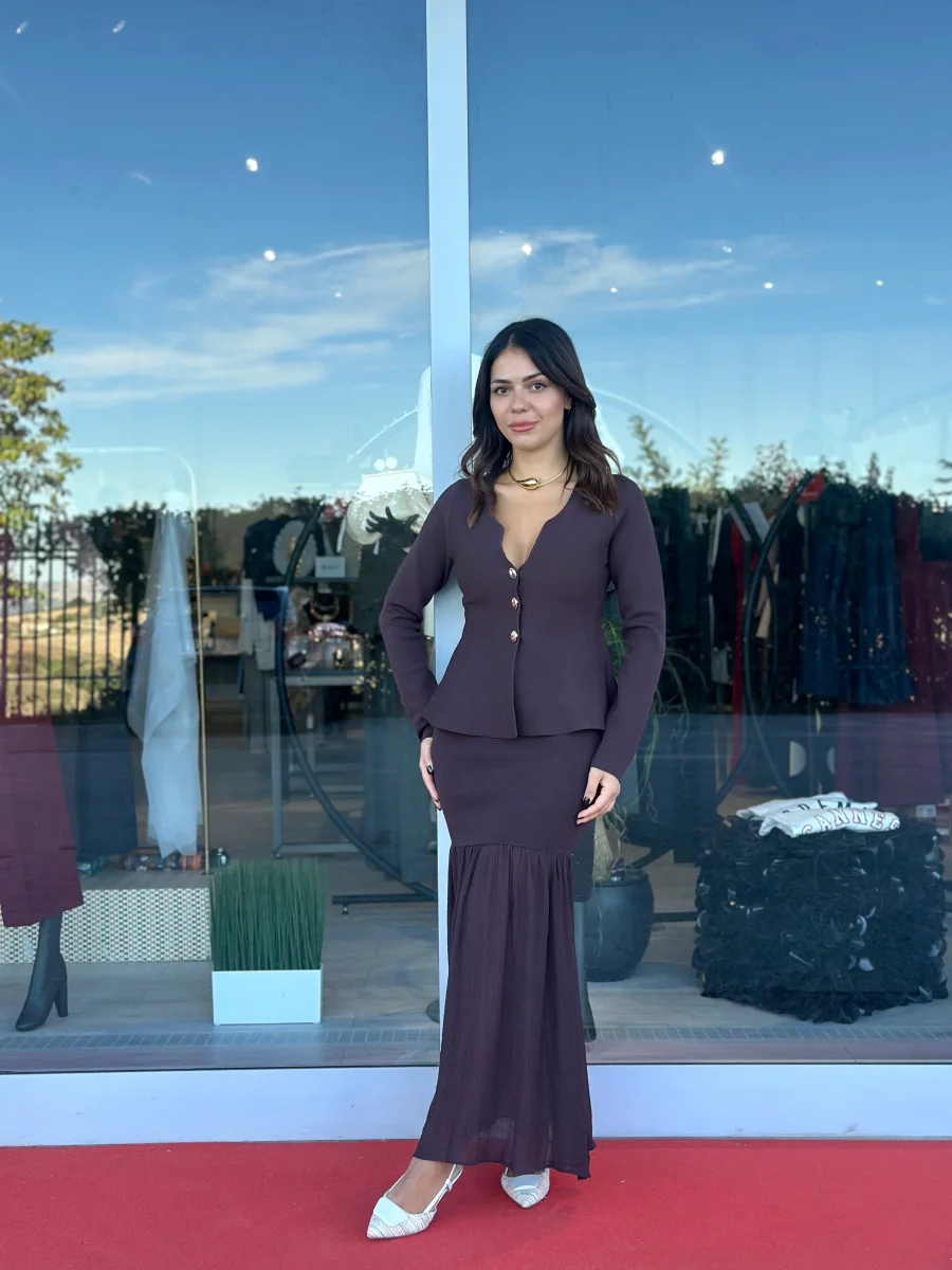 Coordinato in maglia composto da gonna a sirena con fondo in tessuto a contrasto e top modello cardigan con scollo a cuore e bottoni gioiello.