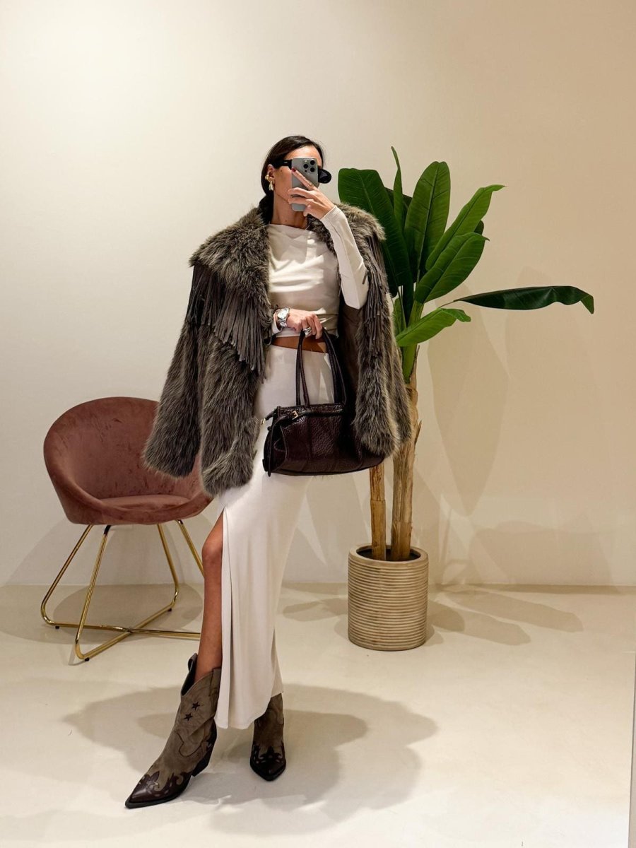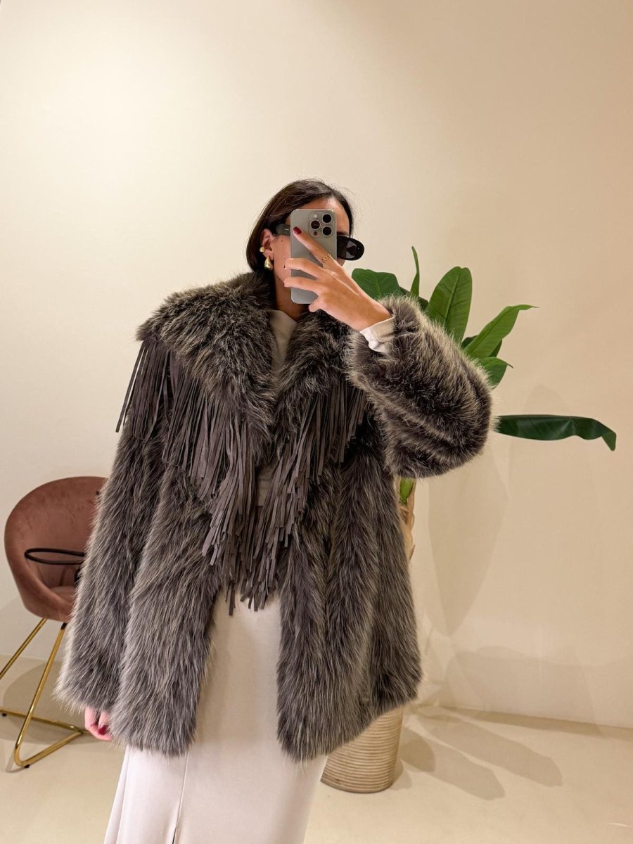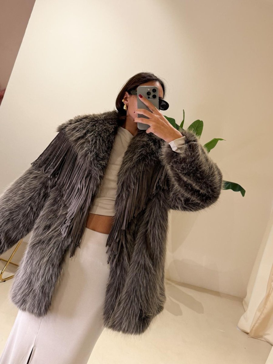 COMPOSIZIONE: 100% POLYESTERE CON APPLICAZIONE FRANGE TAGLIA UNICA, VESTE FINO ALLA M/L Foderata all’ interno Color Taupe