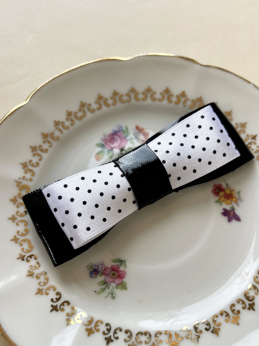 - Doppio fiocchetto di raso a pois bianco e nero e vernice nera abbinata