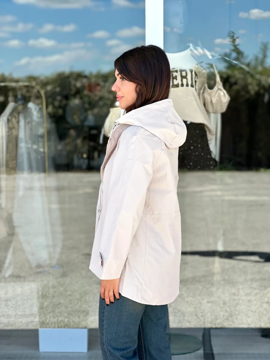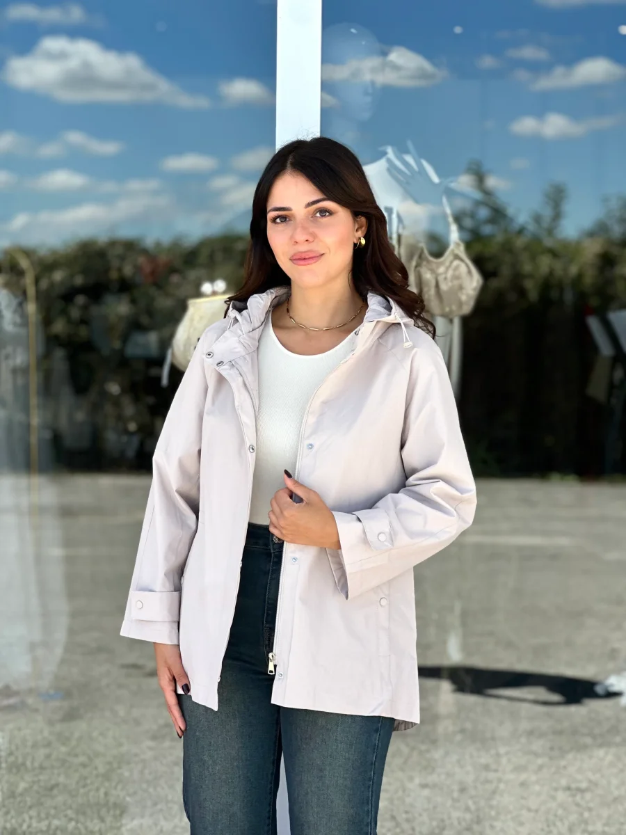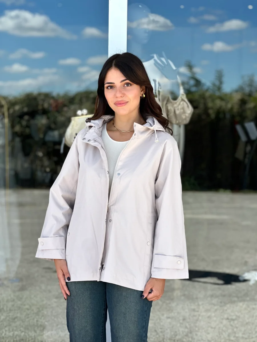 Giacca asimmetrica impermeabile con cappuccio rimovibile e chiusura con cerniera e bottoni automatici.