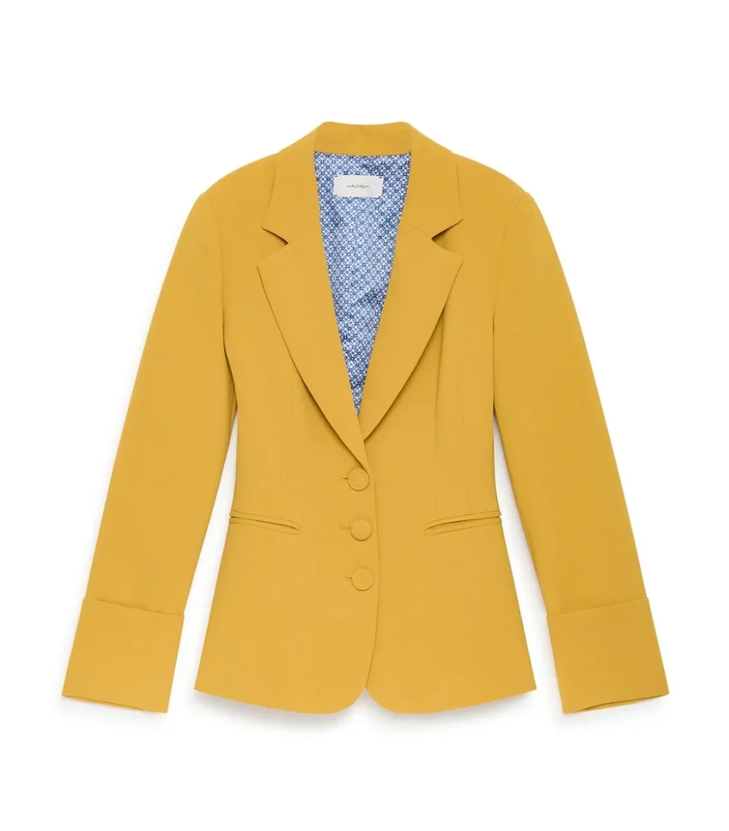 Questa giacca in sablè crepe color senape esalta la silhouette con un design che valorizza il punto vita. Il collo a revers e la chiusura a tre bottoni aggiungono un tocco di raffinatezza, mentre la leggera spallina e la lunghezza al bacino garantiscono comfort ed eleganza contemporanea, perfetta per ogni occasione.