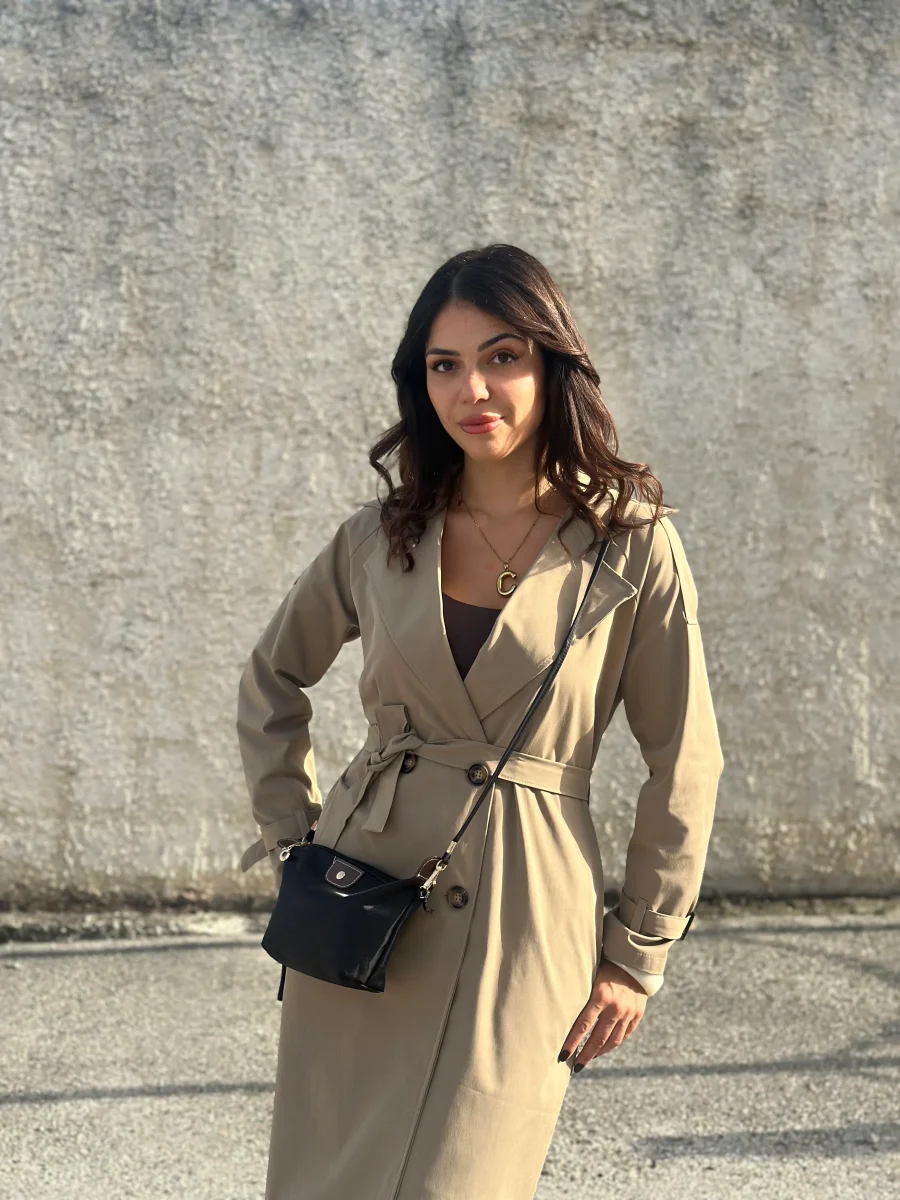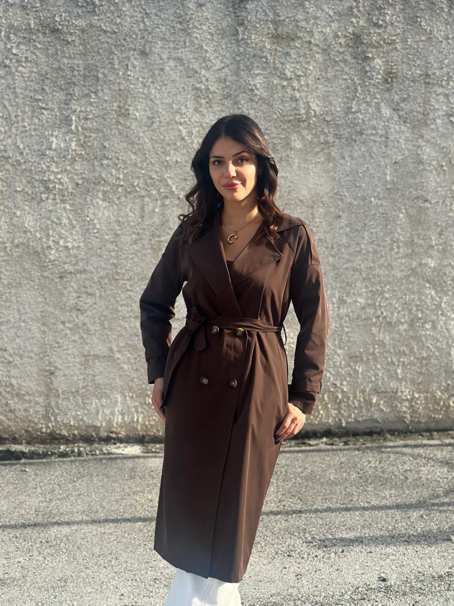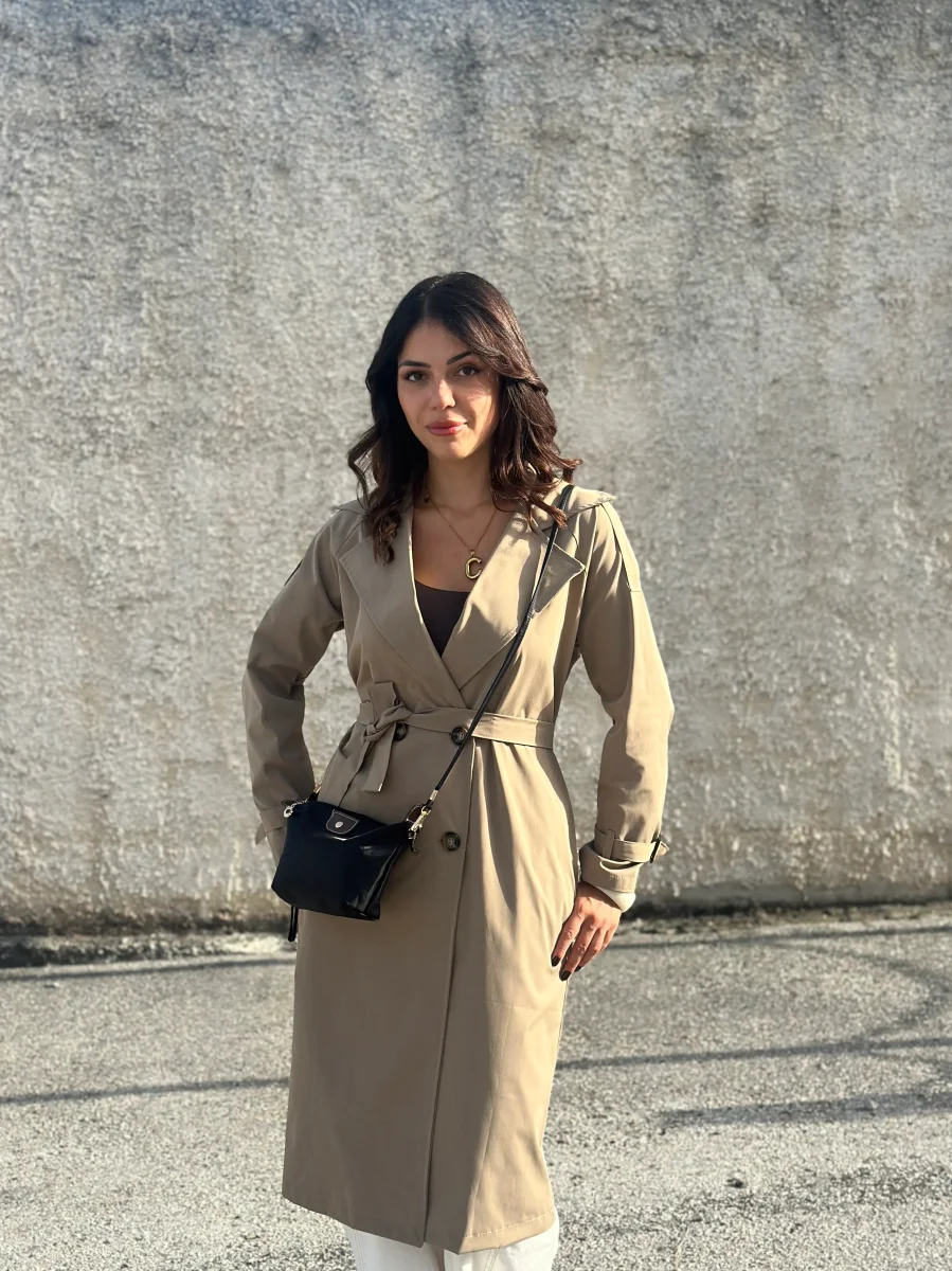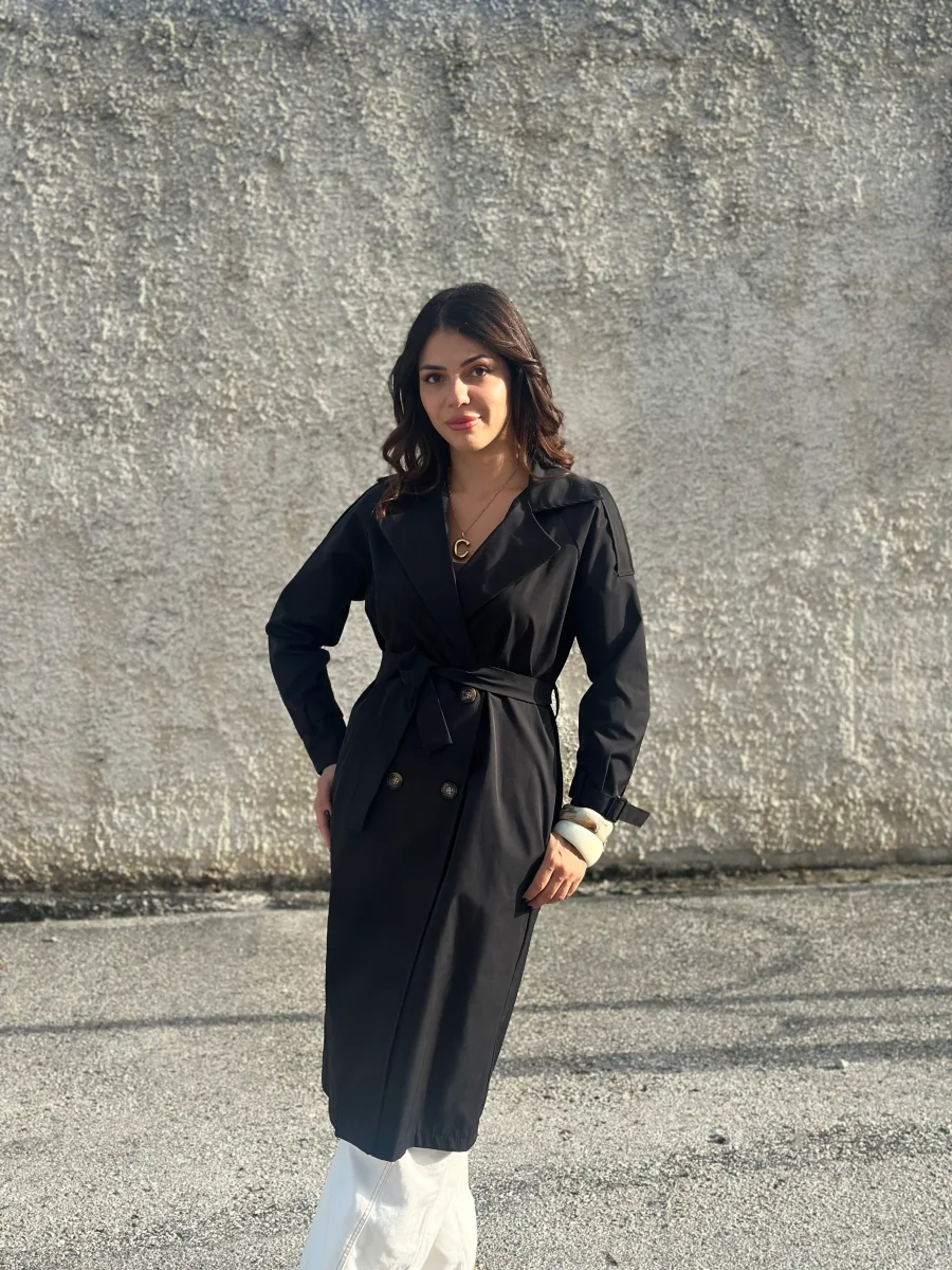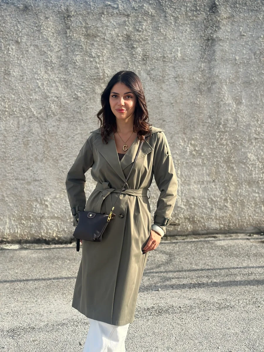 Giacca modello trench lunghezza midi con chiusura doppiopetto e cintura in vita.