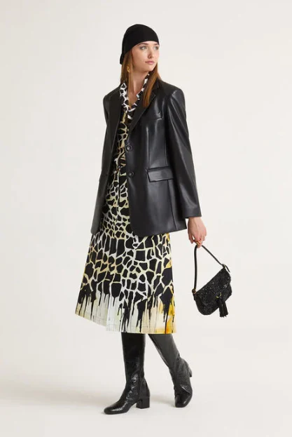 Questa gonna a trapezio unisce stile e praticità con la sua stampa giraffa in bianco, nero e giallo, trasformata in un design pittorico unico che sfuma delicatamente in una vivace colata di colore verso il fondo. Il faldone centrale dona eleganza e movimento, mentre il comodo taglio a cinque tasche con chiusura jeans assicura funzionalità per l’uso quotidiano. Perfetta per chi cerca un capo distintivo senza rinunciare al comfort.