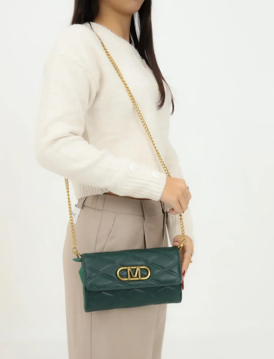 MARC ELLIS Borsa a tracolla Zaira da donna. La chiusura a patta frontale è decorata con il logo dorato “M” in rilievo, aggiungendo un dettaglio elegante e moderno. L’interno è ben organizzato, con più scomparti e una tasca centrale con zip, perfetto per riporre con ordine tutti gli oggetti essenziali. La tracolla a catena, anch’essa dorata, dona un tocco di raffinatezza, rendendola ideale sia per un uso quotidiano che per occasioni speciali. Dimensioni: 23×13,5x3cm.