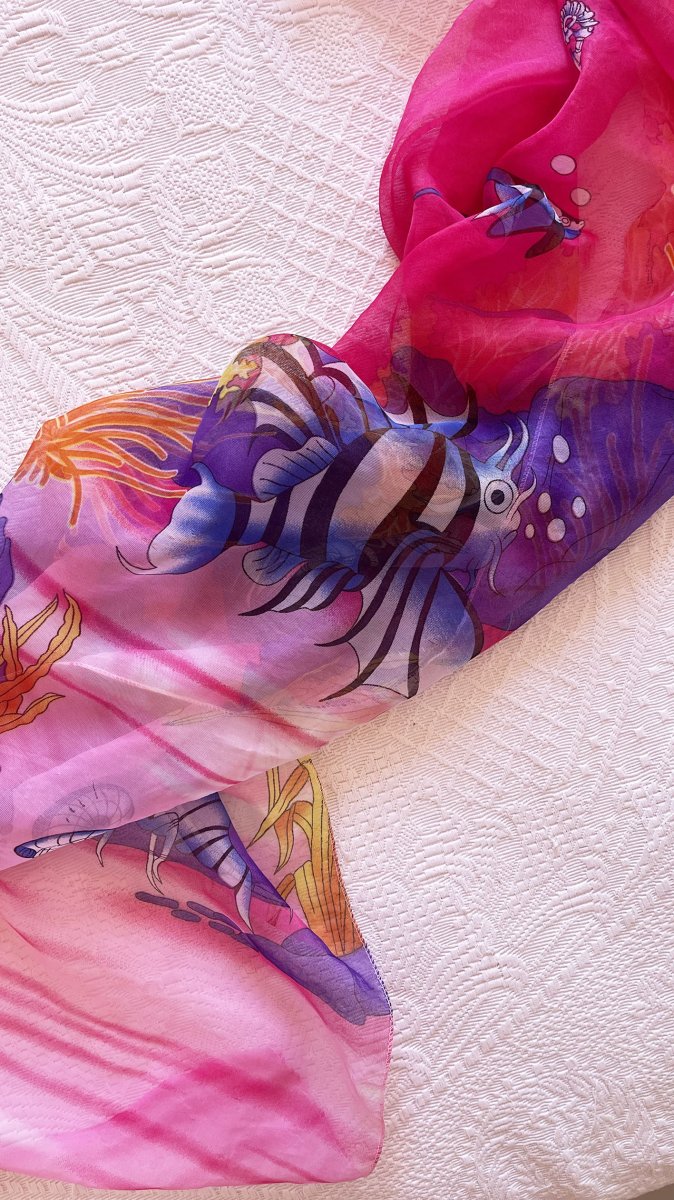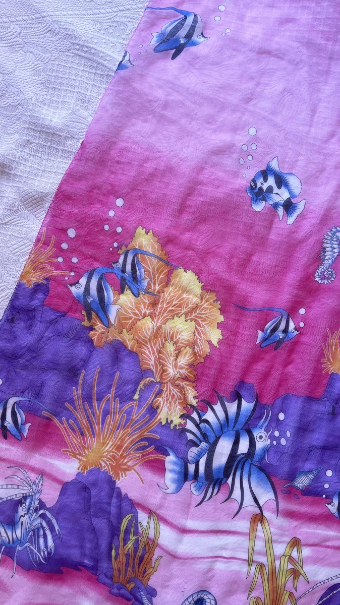 • Tessuto leggero semitrasparente con stampa fondale marino su base fuxia
