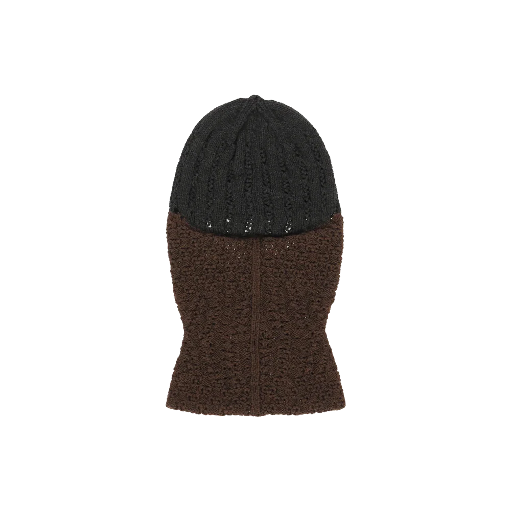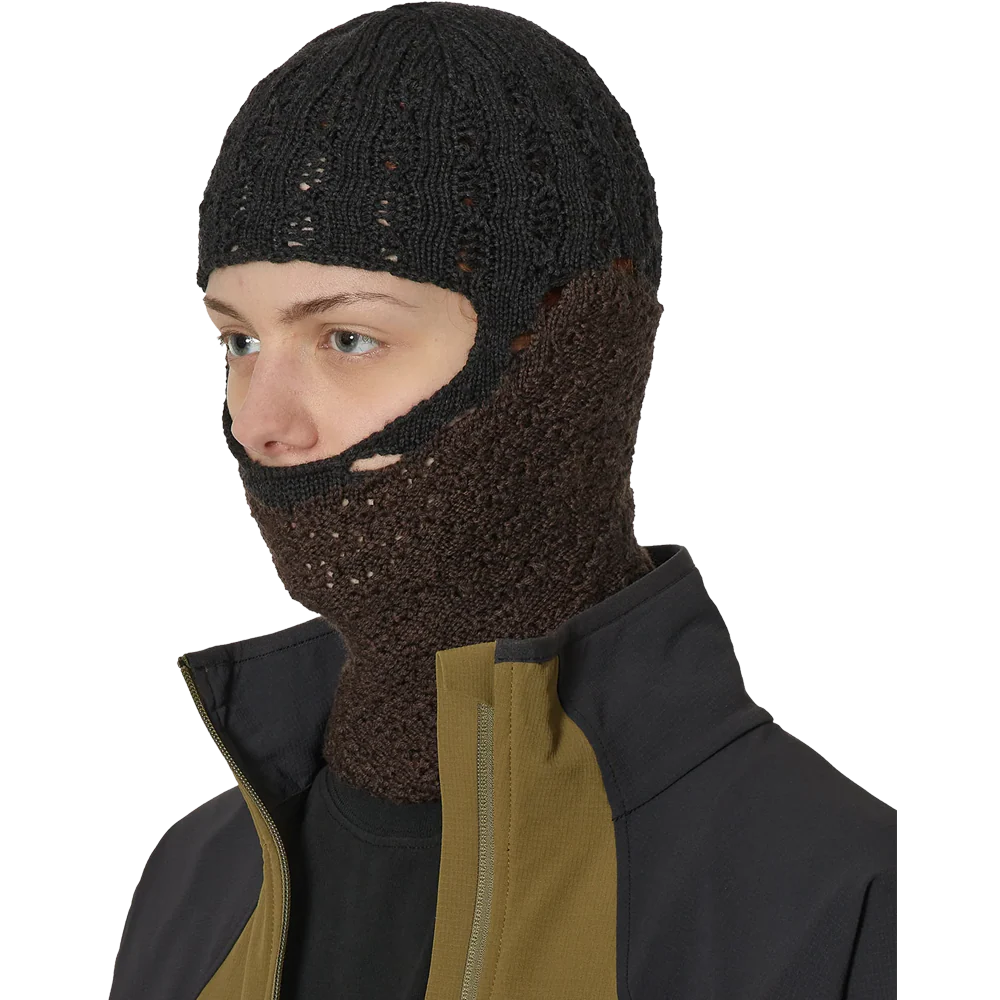 Passamontagna in lana a maglia, colore nero e marrone. L’esclusiva tecnica di lavorazione a maglia, con un design a punto floreale, offre una vestibilità comoda e aderente e previene gli sfregamenti. Le naturali proprietà traspiranti delle fibre di lana contribuiscono a creare un calore asciutto e confortevole e una sensazione di freschezza anche in condizioni di umidità.