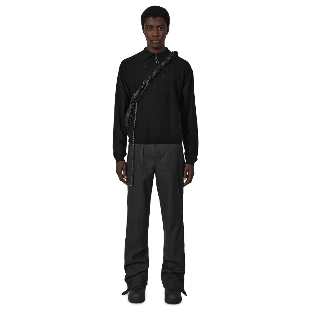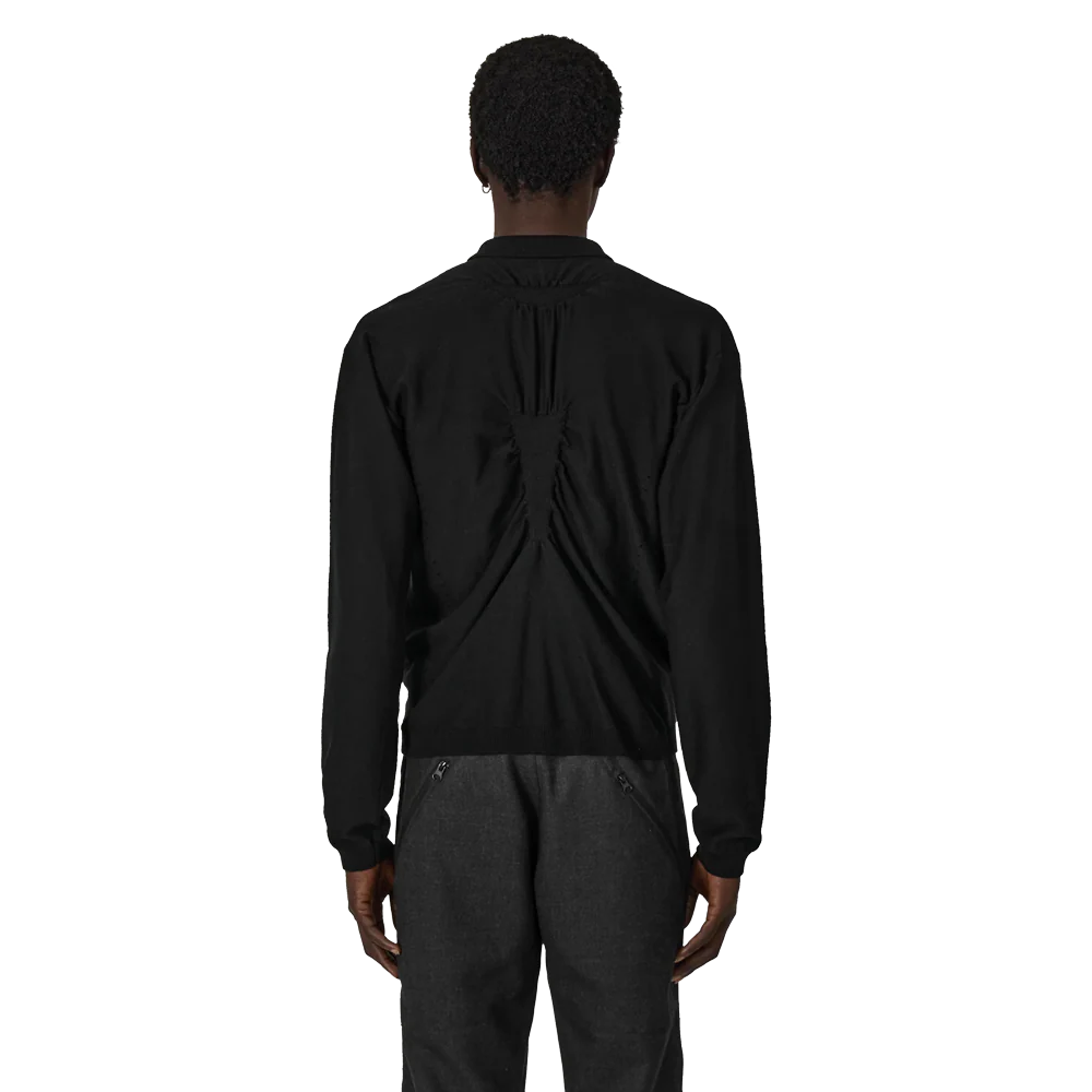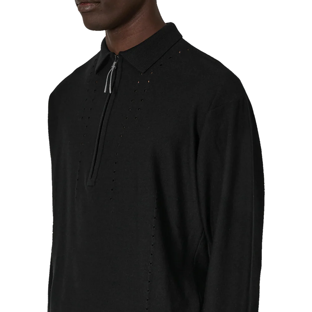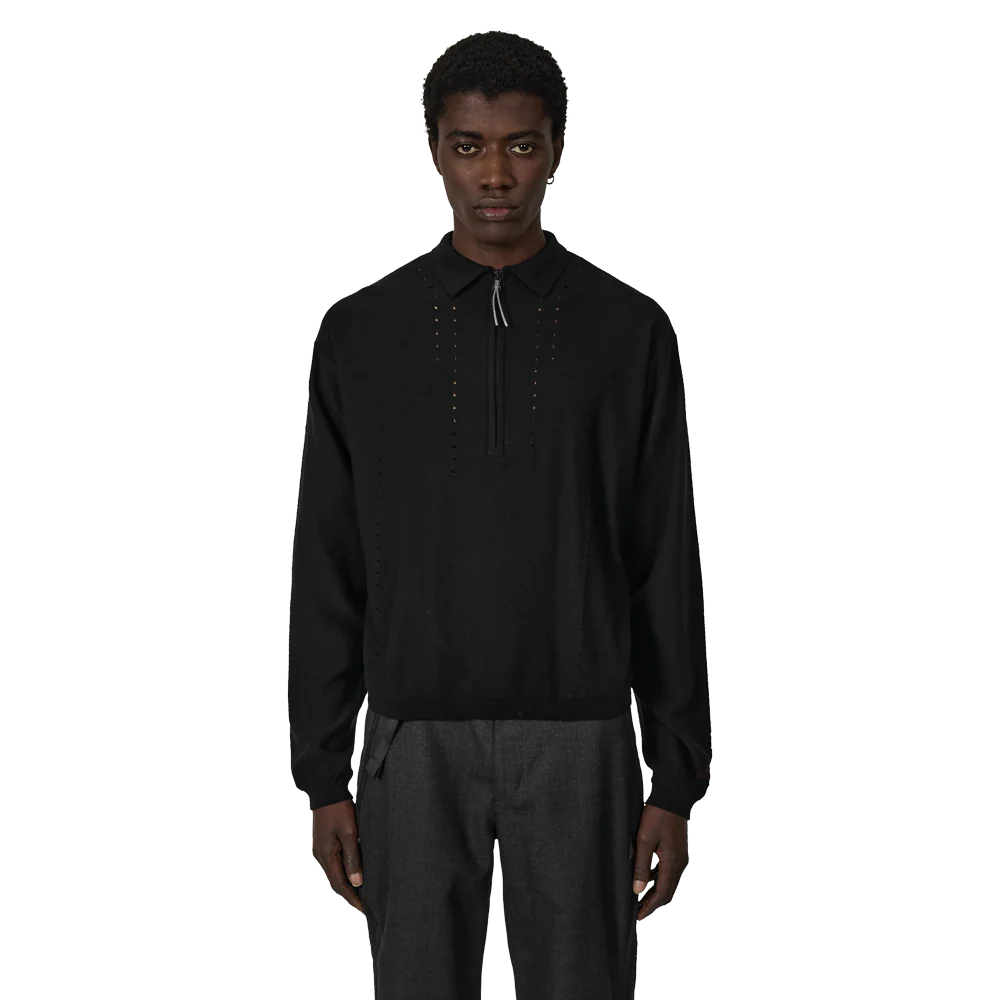 La polo in maglia di lana pinched di colore nero è realizzata in un filato misto lana merino morbido e traspirante, che offre una regolazione naturale della temperatura e comfort. Progettata con una mezza zip frontale per uno stile versatile, presenta fori a maglia larga sul corpo per una texture sottile e traspirabilità. Un esclusivo dettaglio a maglia pinched sul retro aggiunge un tocco raffinato, mentre la vestibilità regolare garantisce una facile indossabilità.