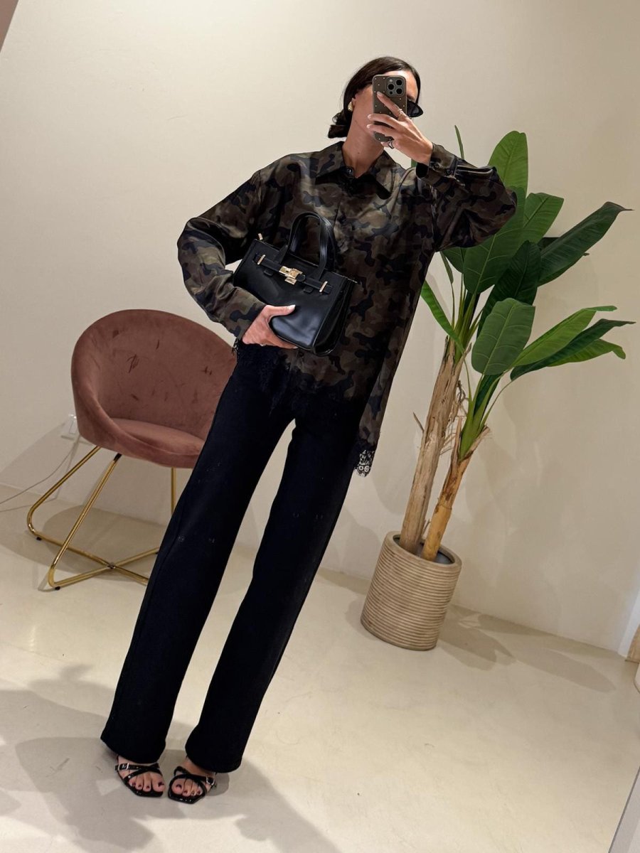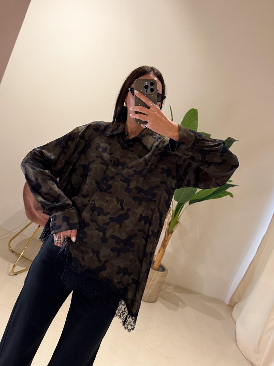 Camicia in stampa camouflage taglio obliquo con pizzo finale in tessuto viscosa ma al tatto rimane calda COMPOSIZIONE:100% VISCOSA