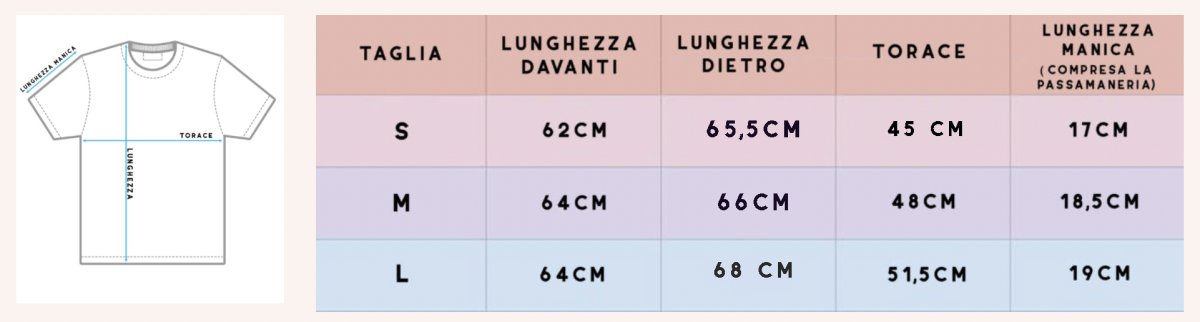 Per trovare la tua taglia ideale puoi consultare la TABELLA TAGLIE, dove troverai le misure della t-shirt, scorrendo le immagini fino all’ultima.