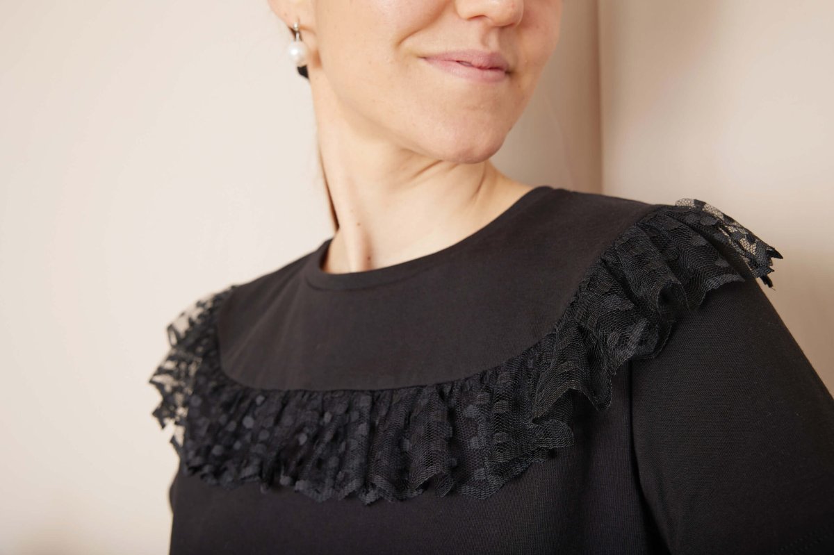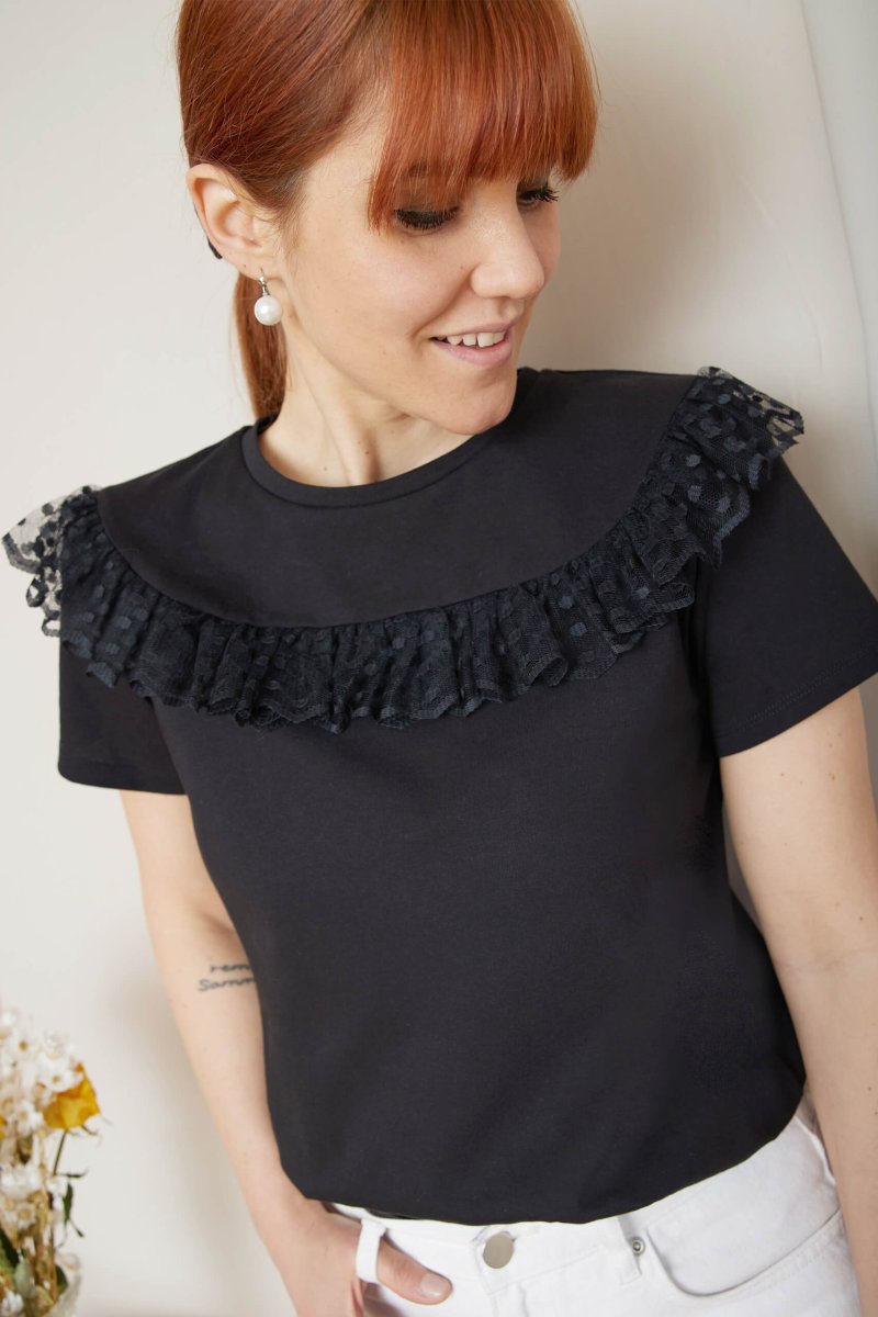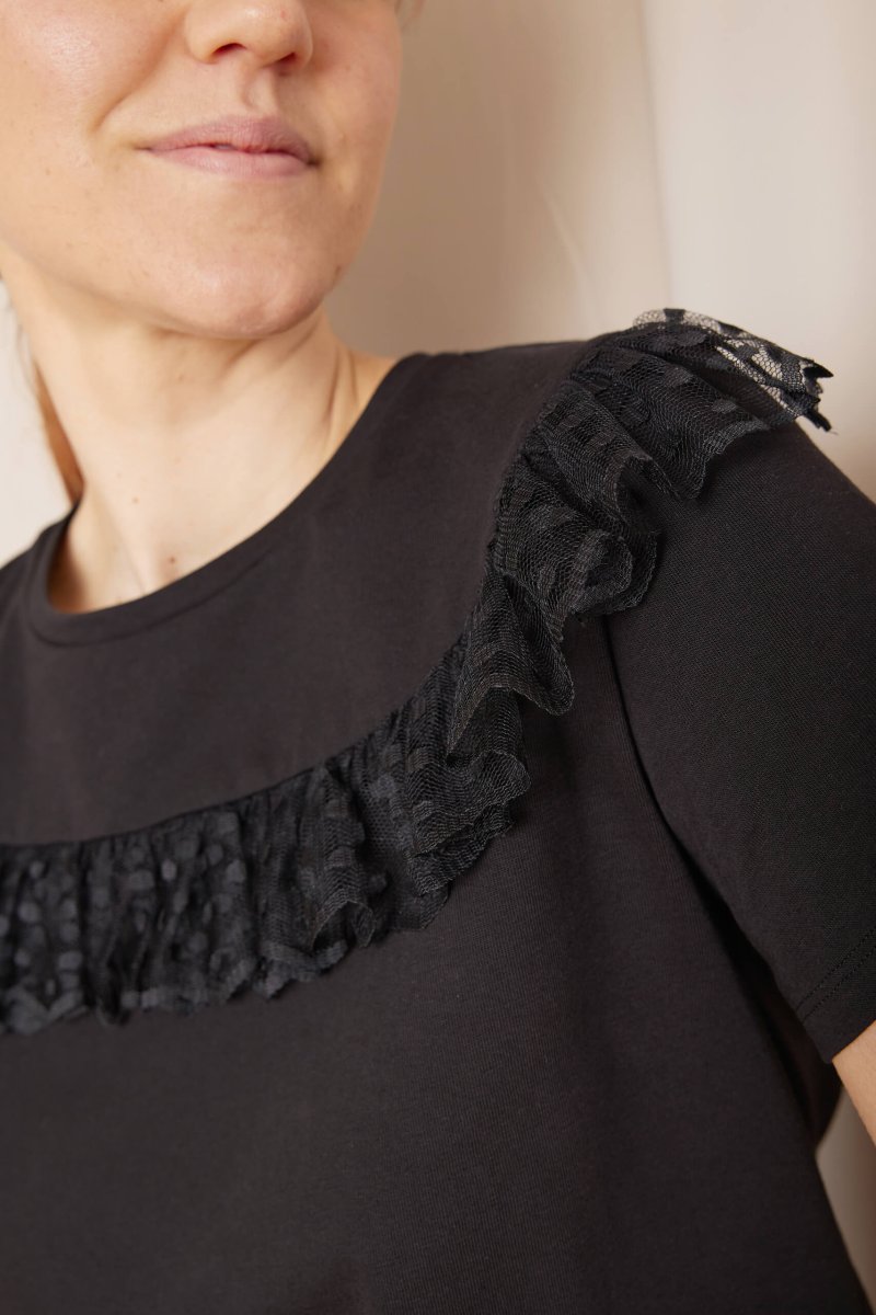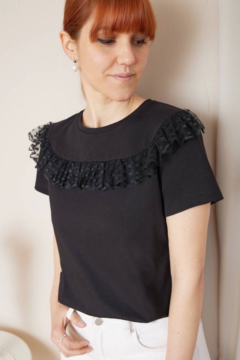 Dettagli romantici per la t-shirt Melodie, con una ruches in tulle arricciata, perfetta per look day&night!
