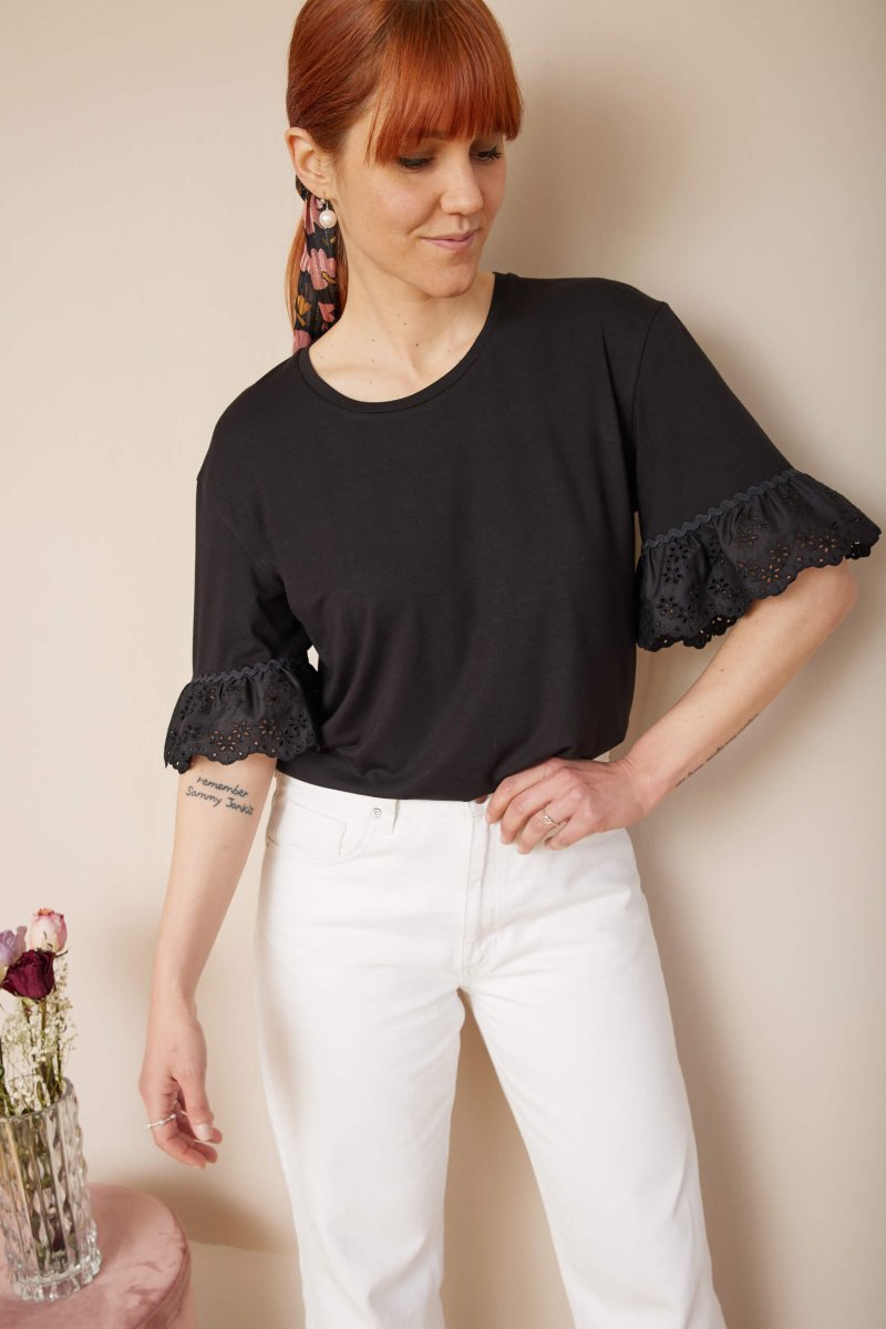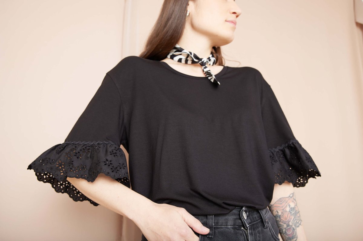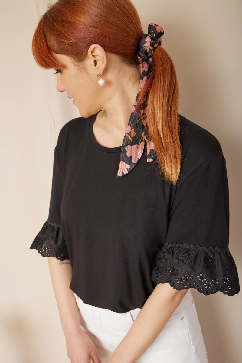 Dettagli un po’ retrò per la t-shirt Michelle, dove il protagonista indiscusso è il sangallo nero leggermente arricciato, arricchito da una passamaneria serpentina che completa l’ampia manica.