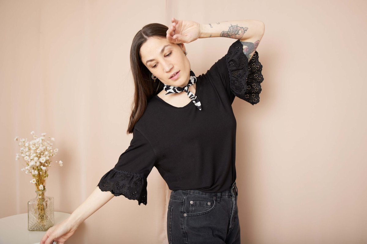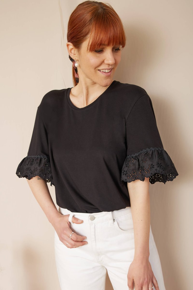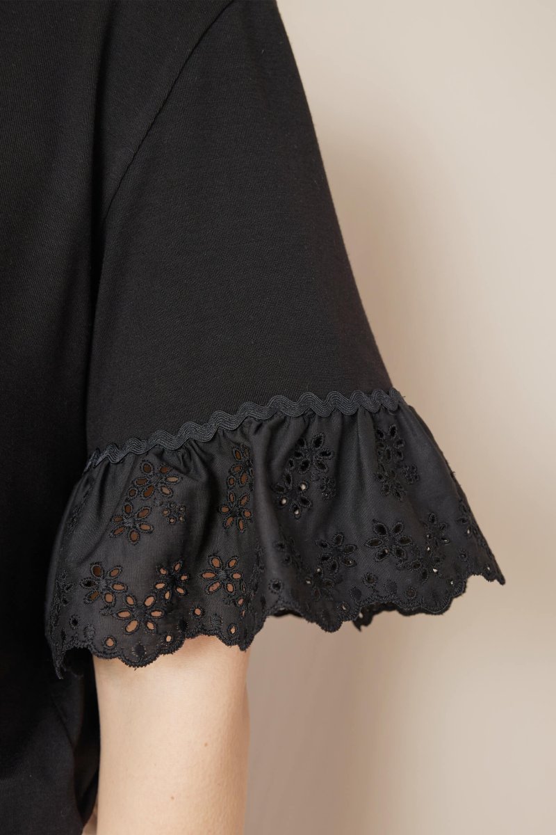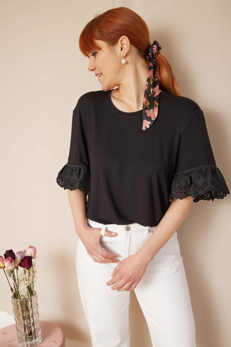 Dettagli un po’ retrò per la t-shirt Michelle, dove il protagonista indiscusso è il sangallo nero leggermente arricciato, arricchito da una passamaneria serpentina che completa l’ampia manica.