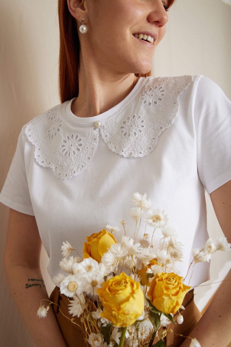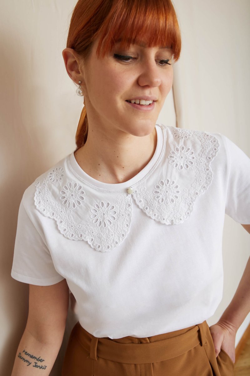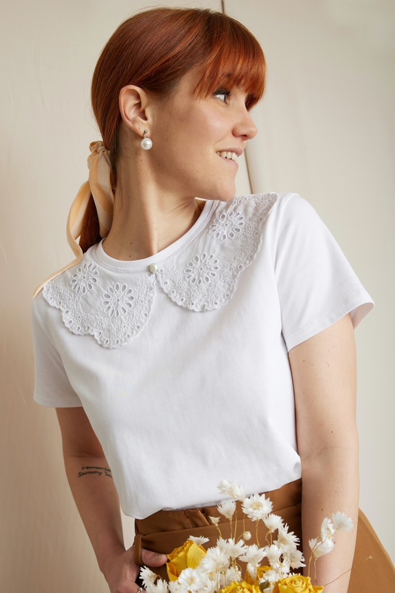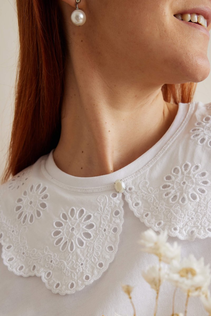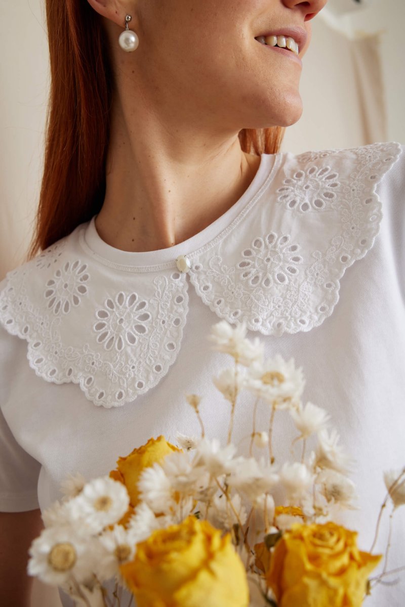 E’ sempre dal passato che prendiamo ispirazione e dunque ecco che anche da Elle O. spuntano i maxi colletti! In sangallo e con un piccolo ma immancabile dettaglio al centro: il ricamo di una perla come punto luce.