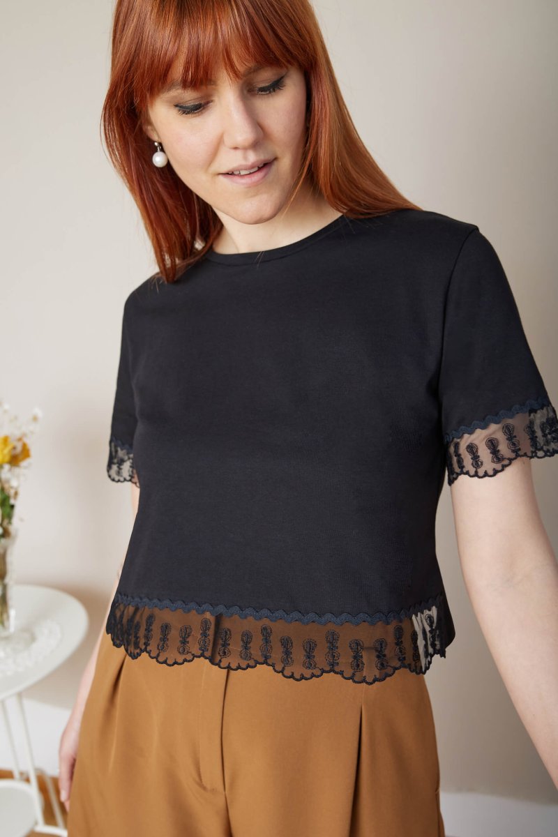 Ecco il primo modello di t-shirt crop di Elle O.! Perfetta da indossare su pantaloni e gonne a vita alta è arricchita da passamanerie in tulle ricamato. Il tutto in total black!