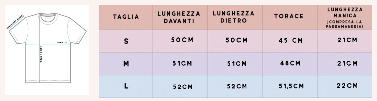 Per trovare la tua taglia ideale puoi consultare la TABELLA TAGLIE, dove troverai le misure della t-shirt, scorrendo le immagini fino all’ultima.