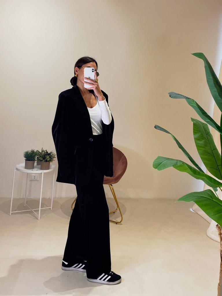 pantalone con elastico dietro e chiusura sul davanti con cerniera e bottone