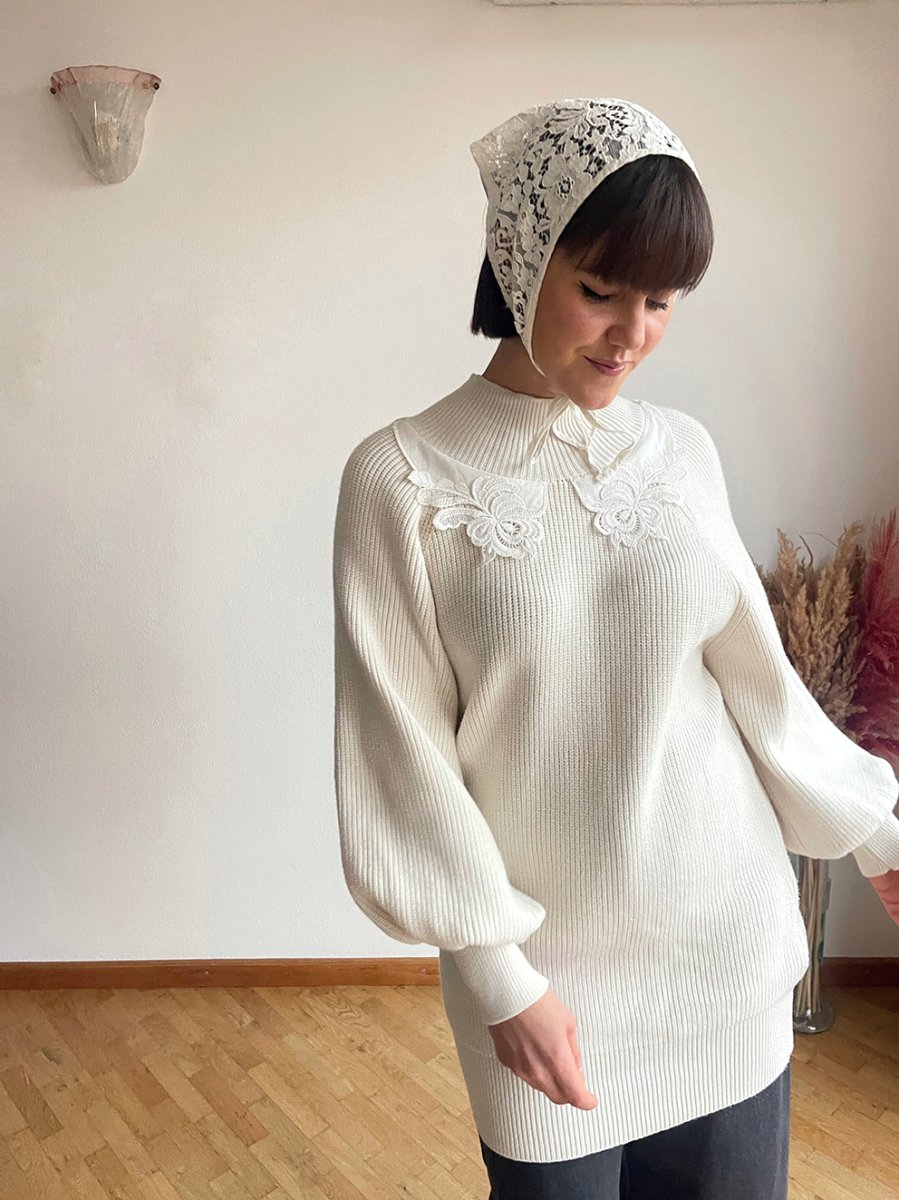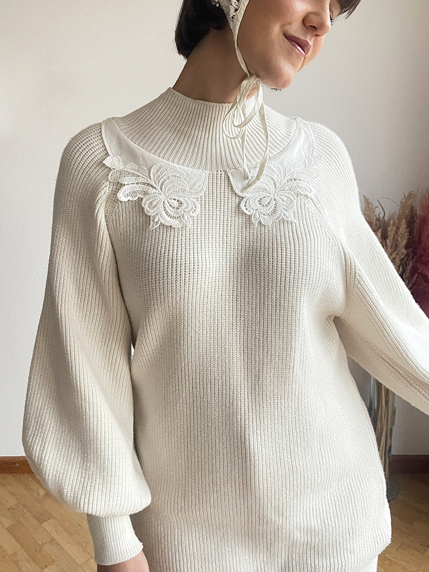Maxi maglia o Mini dress: a voi la scelta con The Offwhite Collar Jumper, con un dettaglio di colletto in macramè ricamato sullo scollo 🤍