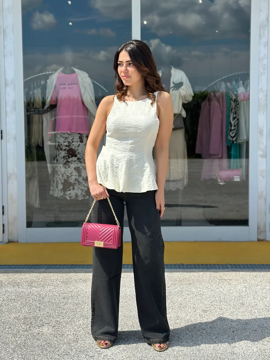 Top con micro fantasia con fiori in rilievo, peplo sul fondo, scollo sul retro con fiocco e zip laterale.