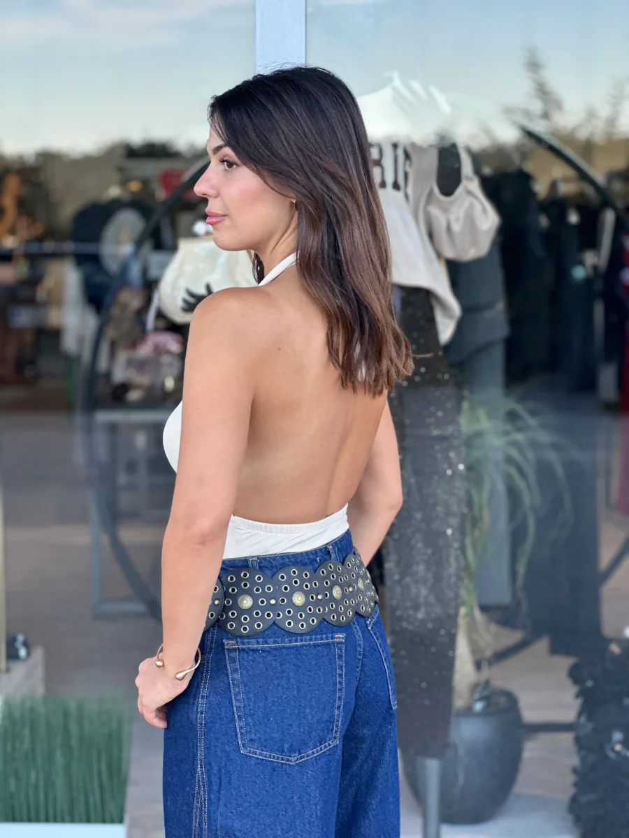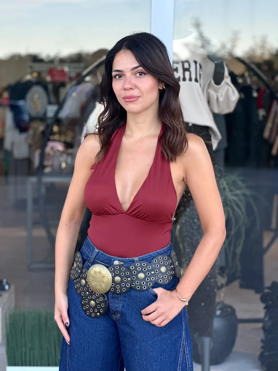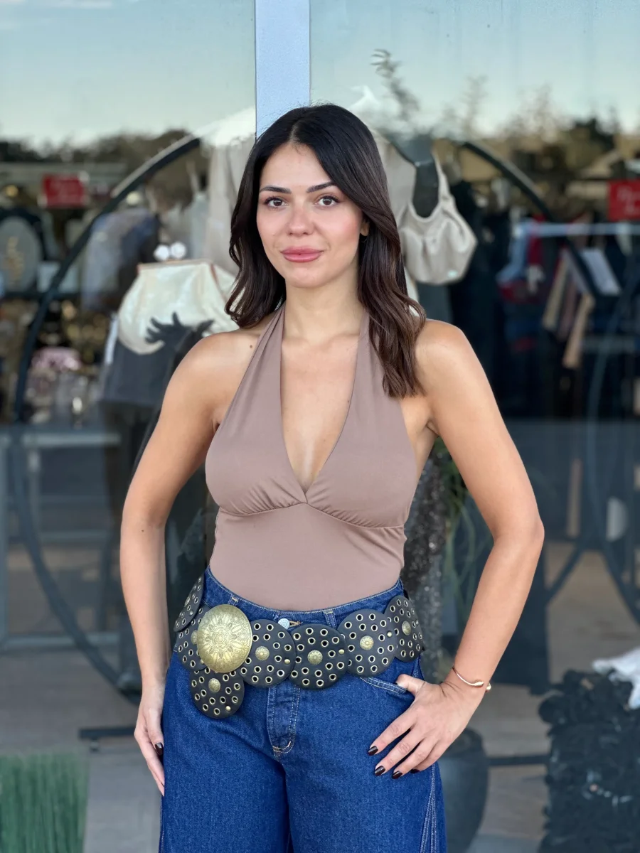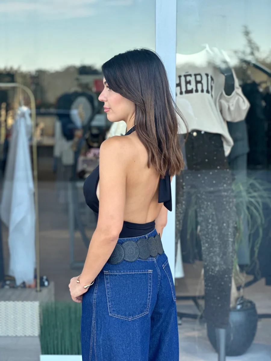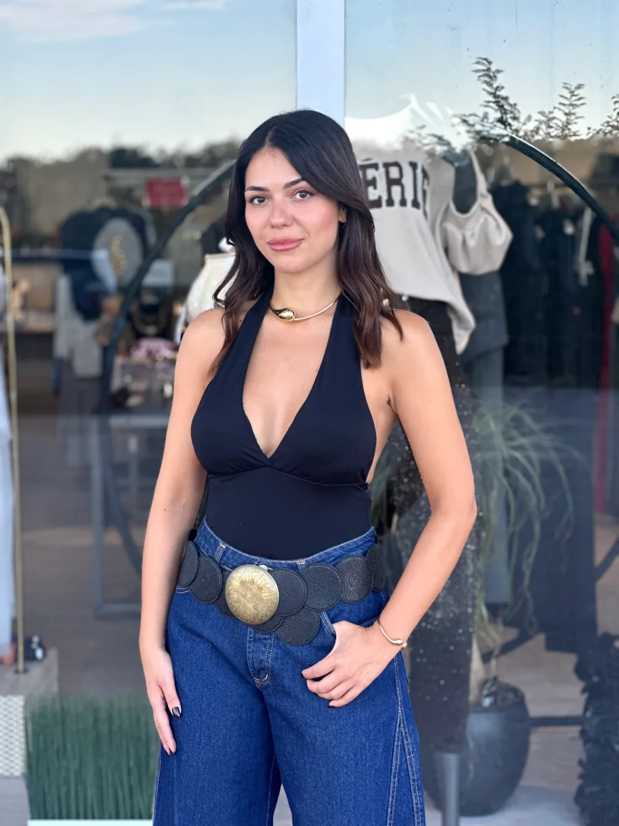 Top in lycra elasticizzata da annodare al collo, scollo sul retro e coppe preformate.